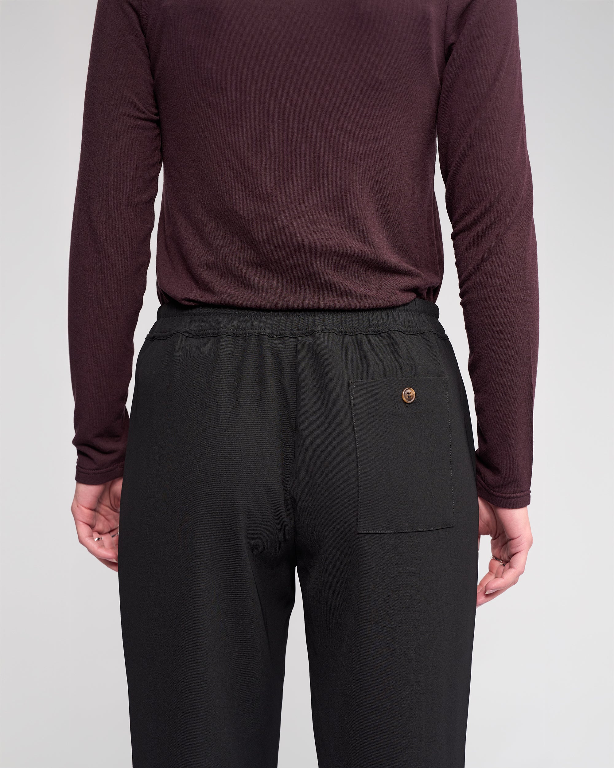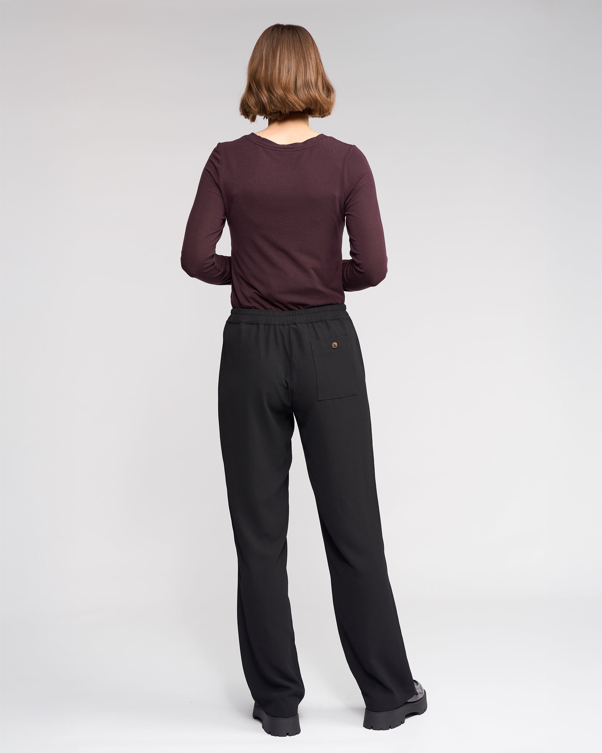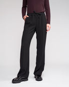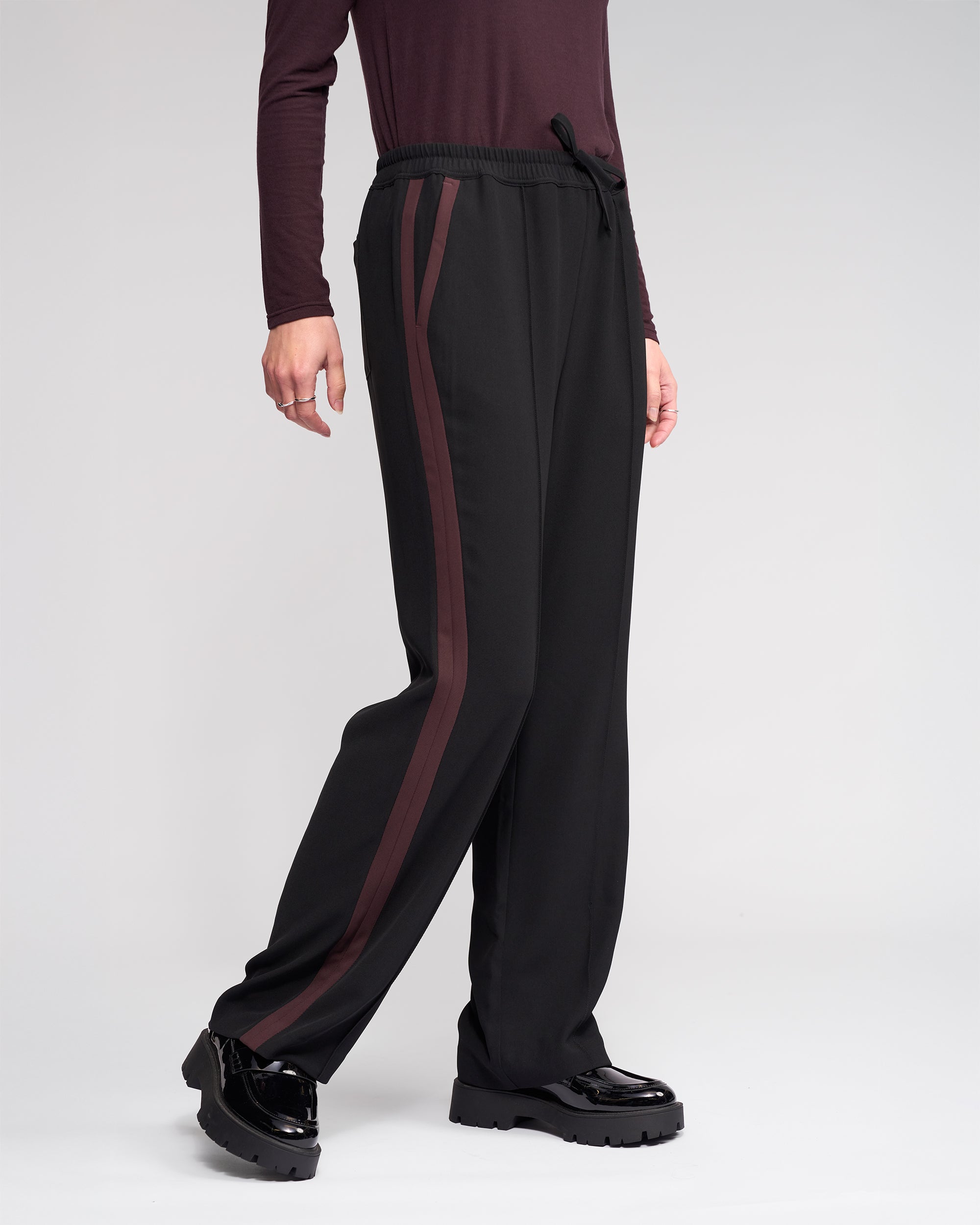 Full-length straight-leg pant in black, featuring contrast Raisin-coloured stripes running down the side seams. Designed in an easy pull-on style with an elasticated waistband and matching drawstrings, this pant offers relaxed comfort with tailored detailing.