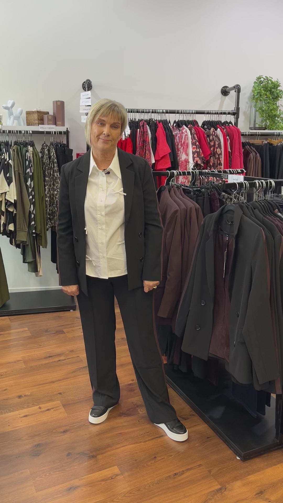 Tailored black blazer with a feature Raisin stripe running down the length of the sleeves. Designed with a classic lapel collar and open front, this fully lined style features decorative buttons at the centre front and welt pockets with flaps. Finished with contrast sleeve detailing, it offers a relaxed yet shaped silhouette for polished everyday wear.