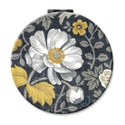 Matte black metal casing with matte black PU on both sides, and a hinged lid featuring a botanical print. Inside has a regular mirror on one side and a double magnifying mirror on the other.