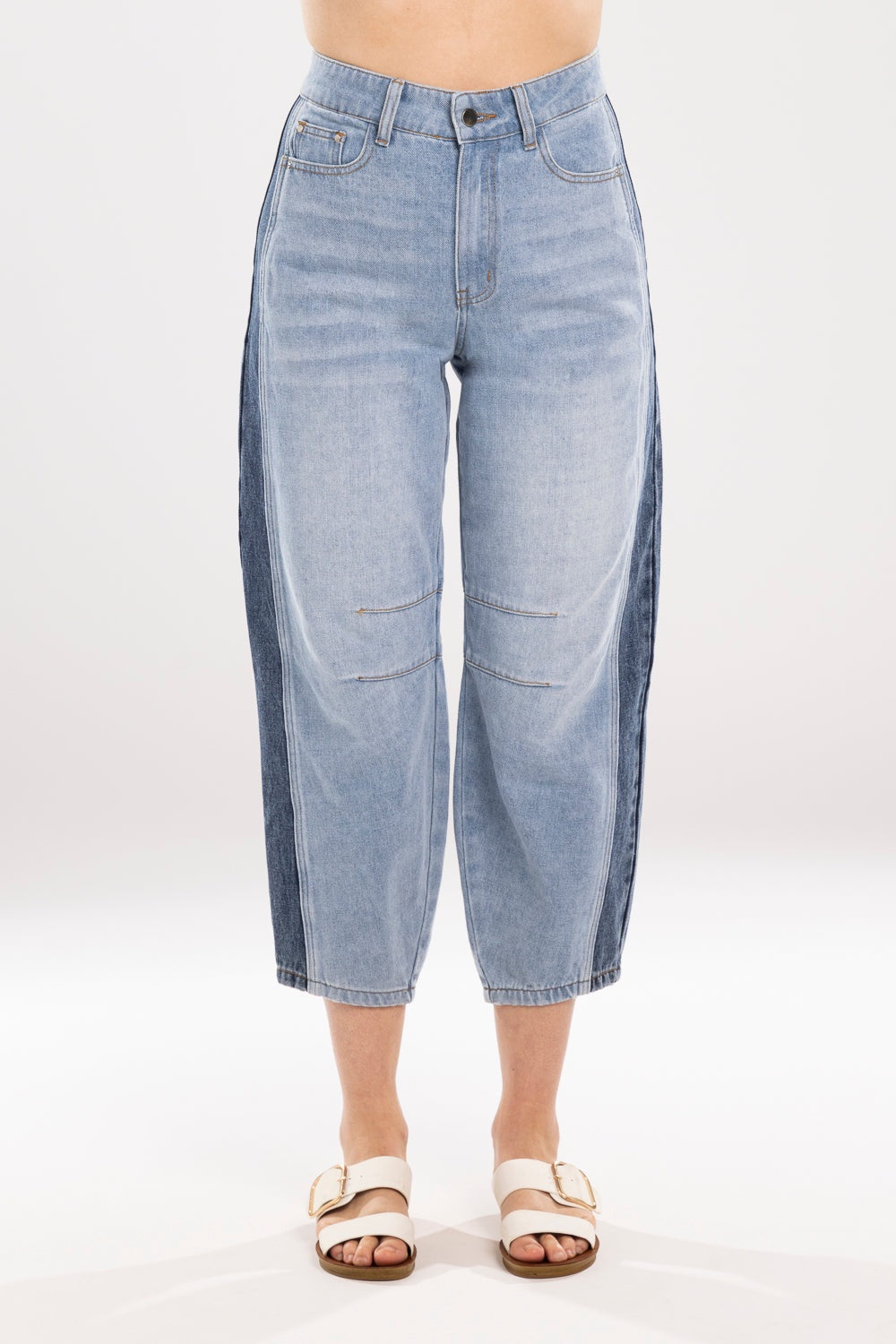 Elevate your casual style with the Mi Moso Double Denim Jeans. These jeans offer a fresh take on a classic with a unique double denim design, featuring a mix of light and dark blue washes for a modern, patched-together look.