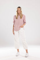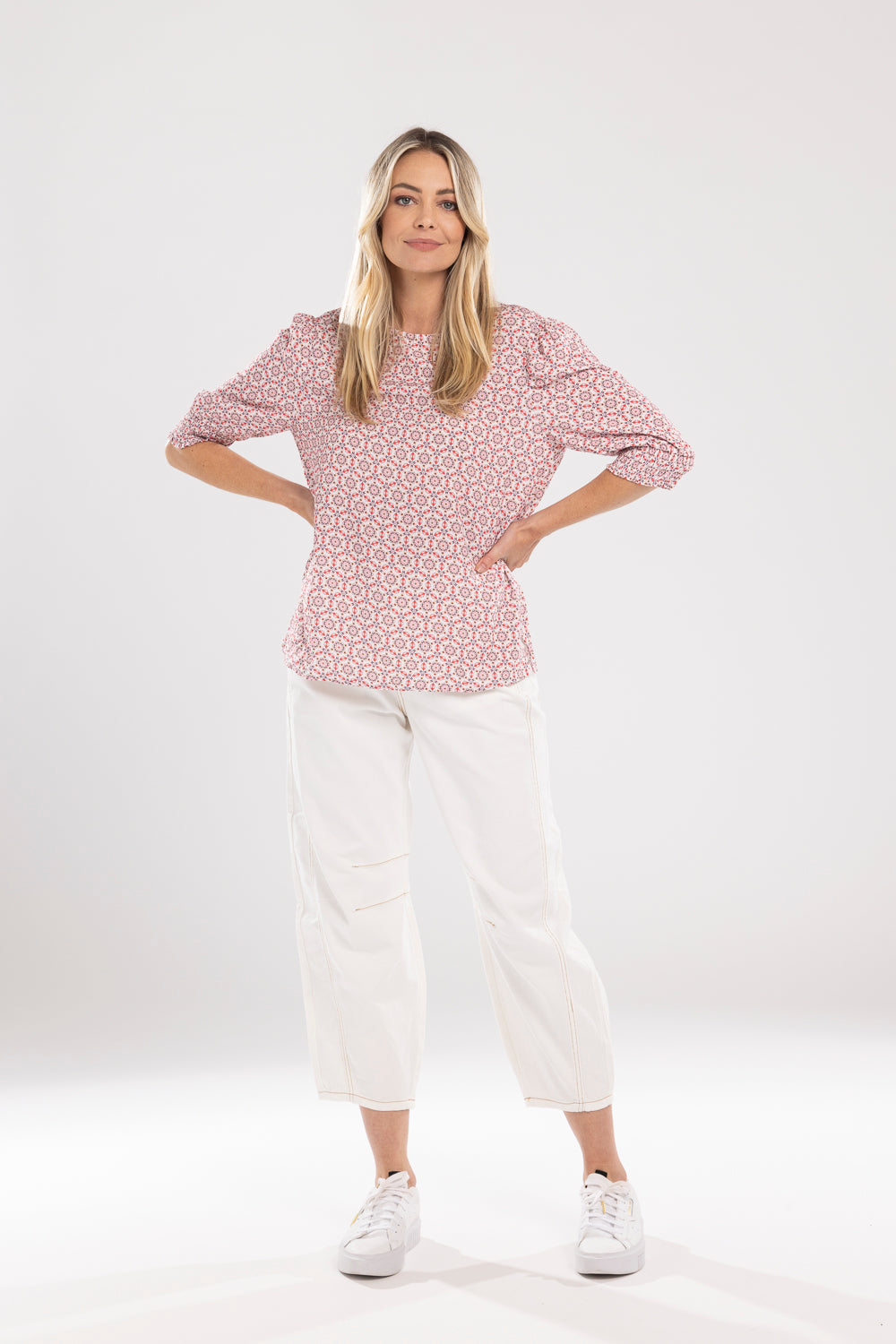 Crafted from 100% rayon, the Finley Top is incredibly soft, lightweight, and breathable, making it perfect for warmer days. It is designed with a high, round neckline and a relaxed fit that drapes beautifully. The elasticated cuffs on the three-quarter length sleeves create a subtle puff effect, adding a romantic and delicate detail.