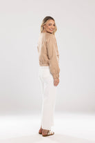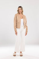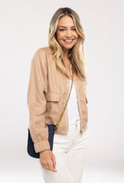 Add a layer of effortless cool to your look with the Mi Moso Zip Line Bomber in a chic, versatile Taupe. This relaxed-style bomber jacket is the perfect light layer for trans-seasonal wear.