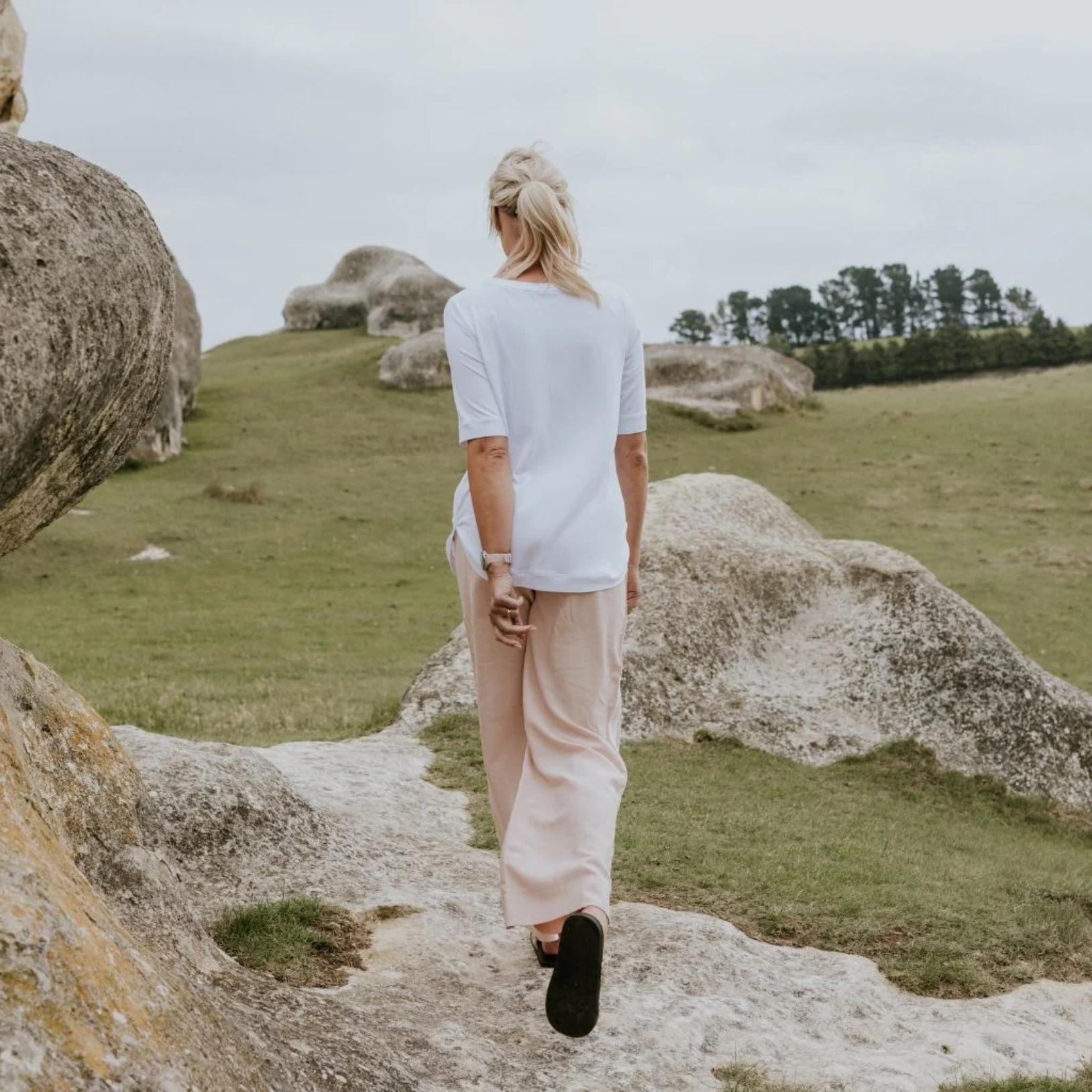 With its relaxed cut, the Ruby skims in all the right places, while the elegant boat neckline draws the eye upward and balances the shoulders. Elbow-length sleeves provide confident arm coverage, and the gently curved hem softens the silhouette for a flattering finish.