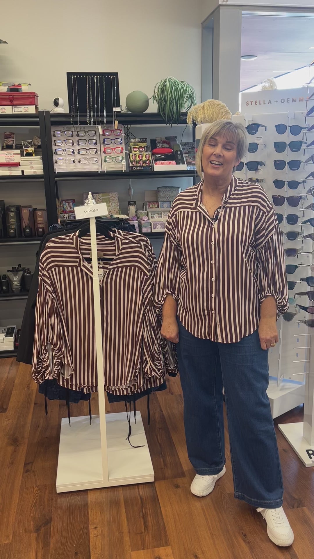 The Bronte Shirt in Chocolate/Ivory Stripe (note we think the colour is more mauve than ivory), features elegant balloon sleeves and intricate panel detailing, making it a standout summer essential. Crafted to combine style and comfort, this piece adds a fresh, vibrant touch to your wardrobe with its unique moss-inspired color infusion. Perfect for easy days, it offers a flattering silhouette while maintaining breathability and ease of movement.