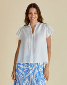 The Lyra Blouse blends romantic detail with everyday ease. Featuring a round keyhole neckline with a tie-up, flutter sleeves and frilled collar detailing, it offers a soft, elevated look. Shirred panels create gentle texture, while the relaxed fit ensures all-day comfort. Effortless and timeless, it’s a transeasonal favourite.