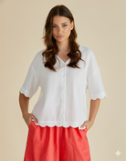 The Scarlett Shirt brings an elevated edge to relaxed dressing. Crafted with a touch of linen, it features a V-neckline, button-up front and intricate scallop trim along the sleeves and hem. Its relaxed silhouette adds an effortless, feminine charm. A timeless transeasonal piece that feels both refined and easy.