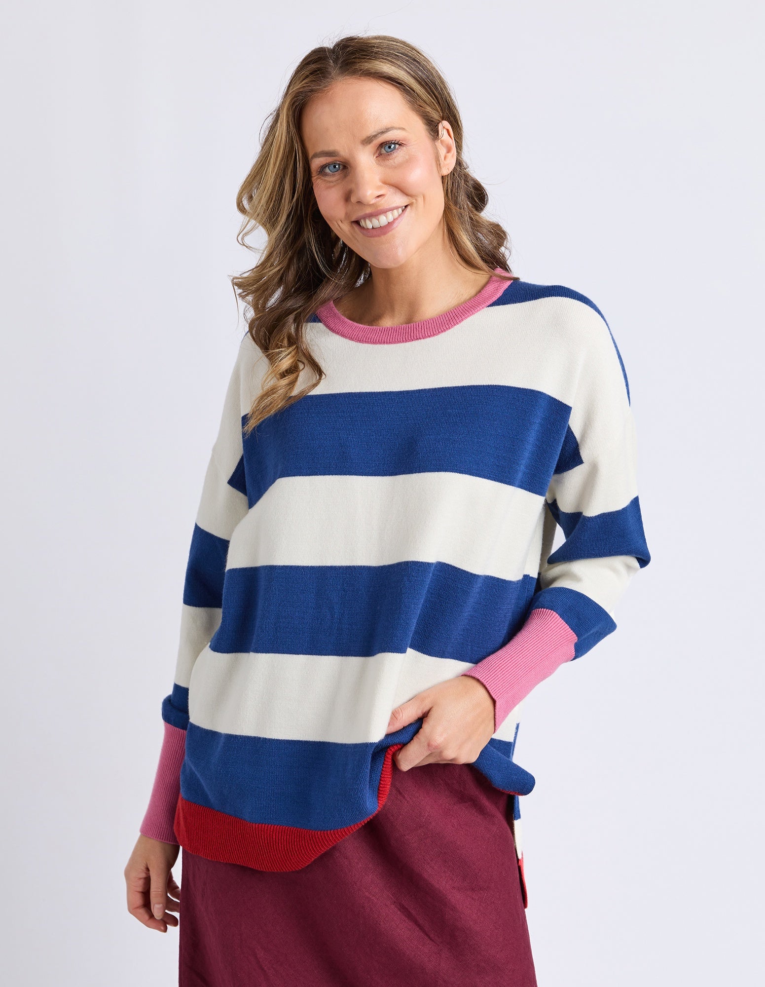 Elevate your everyday knitwear collection with the Elvie Block Stripe Knit from Elm. This isn't just your standard striped sweater; it’s a playful, contemporary take on a timeless silhouette that brings a pop of color to those cooler days.
