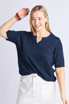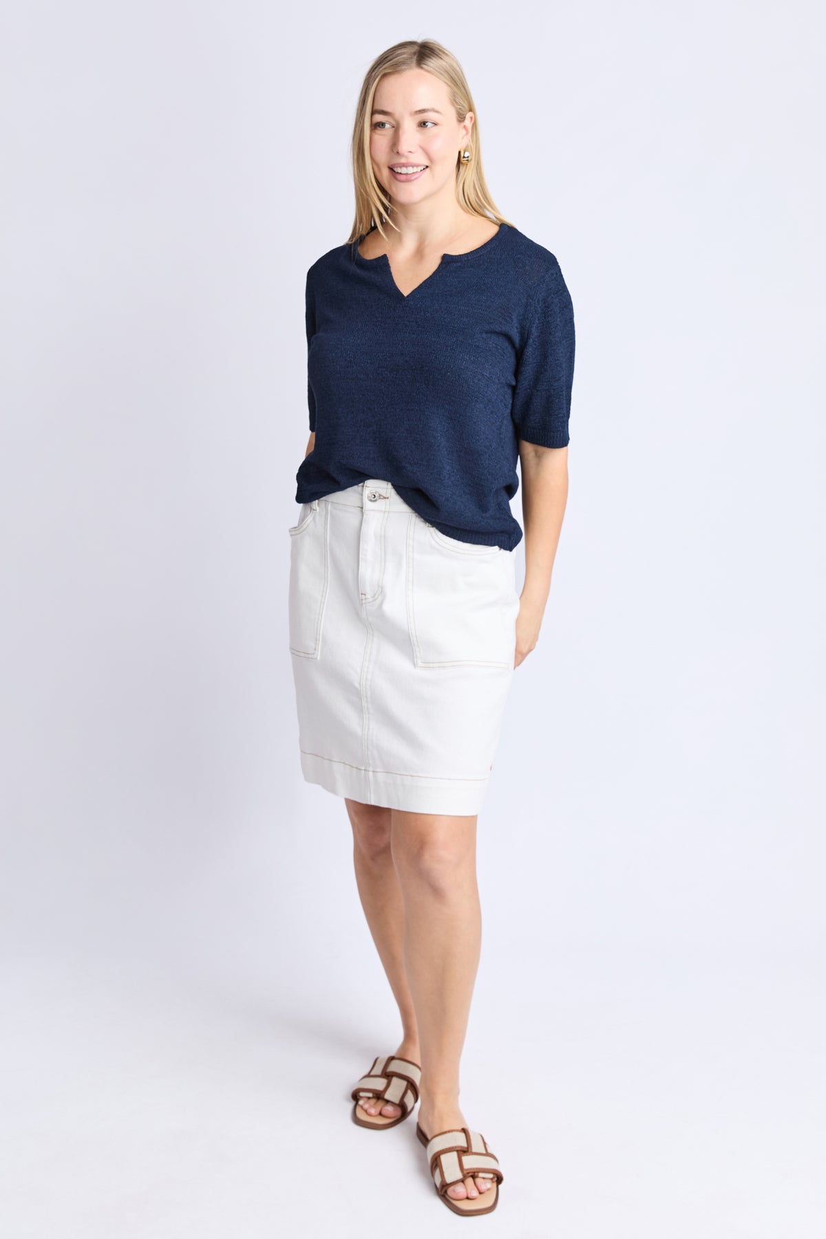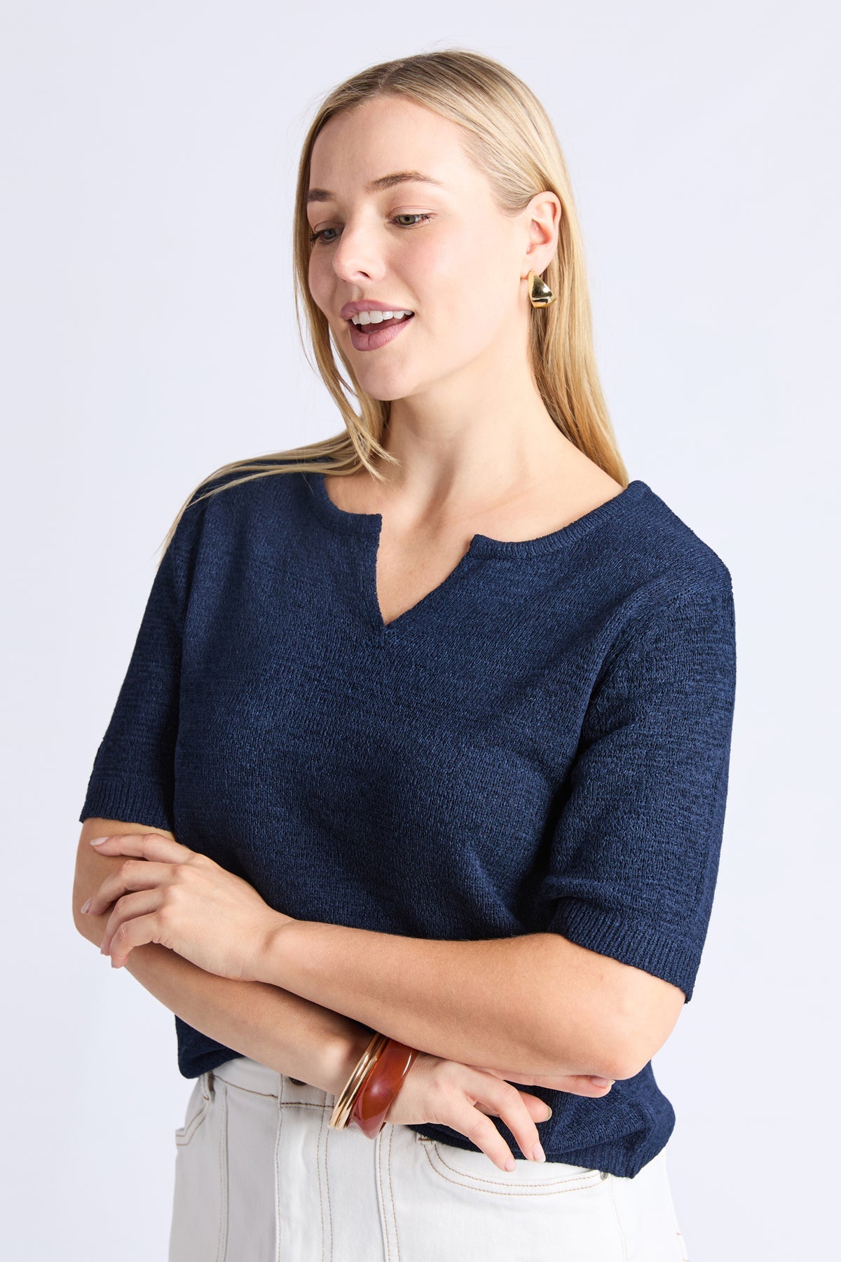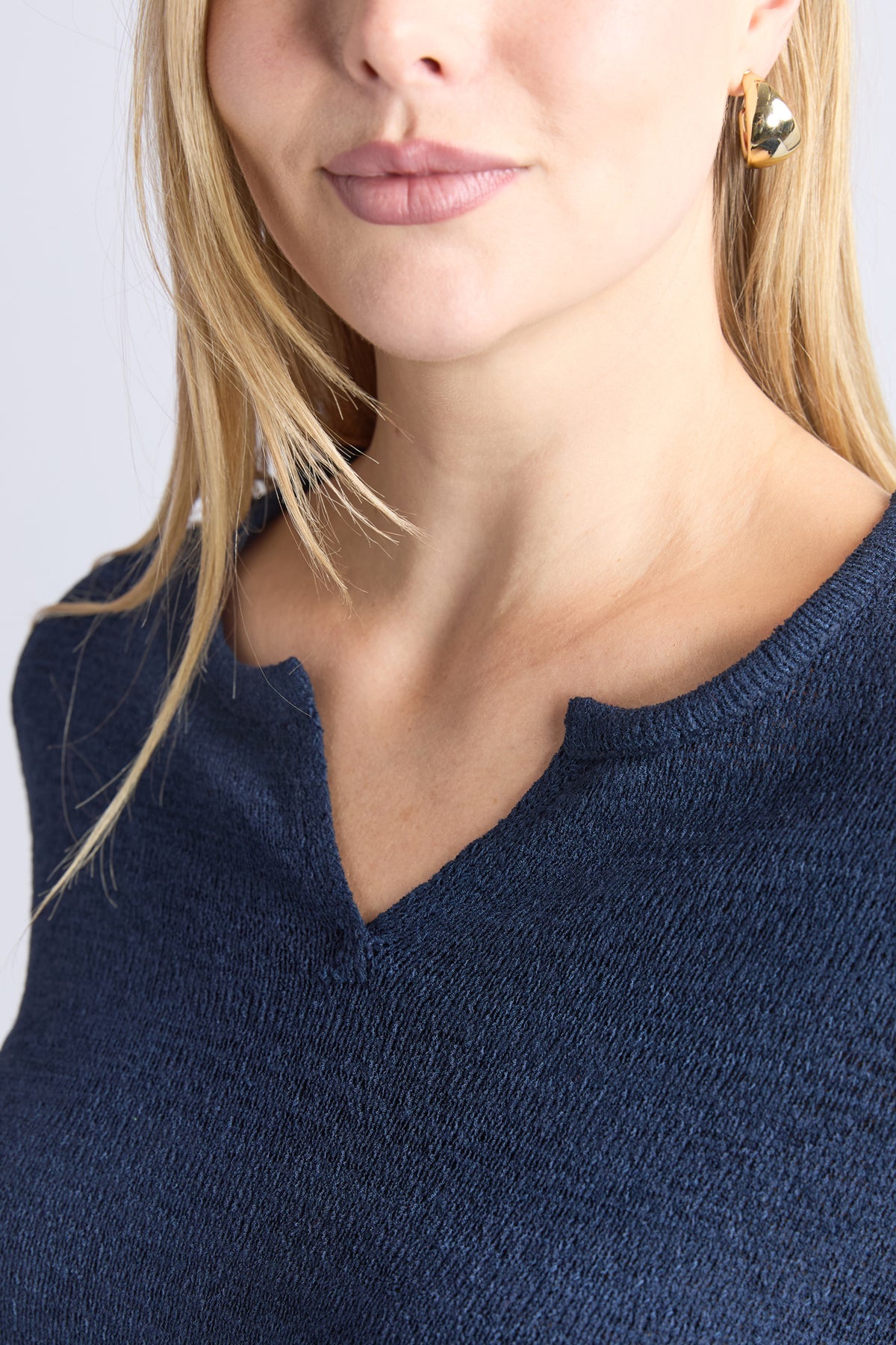 The Knit Tee combines a relaxed fit with a cool yarn that ensures breathability and comfort. Its V-neck design adds a touch of effortless style, making this tee ideal for layering or wearing on its own in warmer weather.