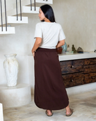 The Resort Skirt offers a flowing, full-length silhouette with a side split for added flair. Its high-rise, elastic waistband ensures a comfortable fit for all-day wear. Perfect for versatile styling, this skirt transitions smoothly from casual to elegant settings.