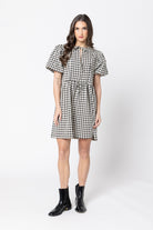 Capture a look of playful sophistication with the Leila + Luca Belle Bow Dress in the timeless 'Check Mate' print. This mini dress is an absolute essential for effortless style, featuring beautiful feminine details and a versatile monochrome pattern.