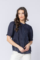 The standout feature of the Bonita Top is the exquisite detailing on the front: extensive pin-tucking and ruching across the bodice creates a flattering texture that gently shapes the silhouette. It is finished with a neat mandarin/band collar and a classic button-front placket. The sleeves are short and beautifully voluminous with a gathered, slightly ruffled cuff, adding a touch of romantic flair.