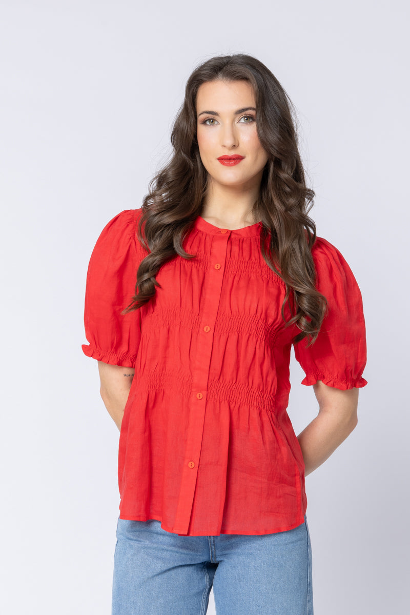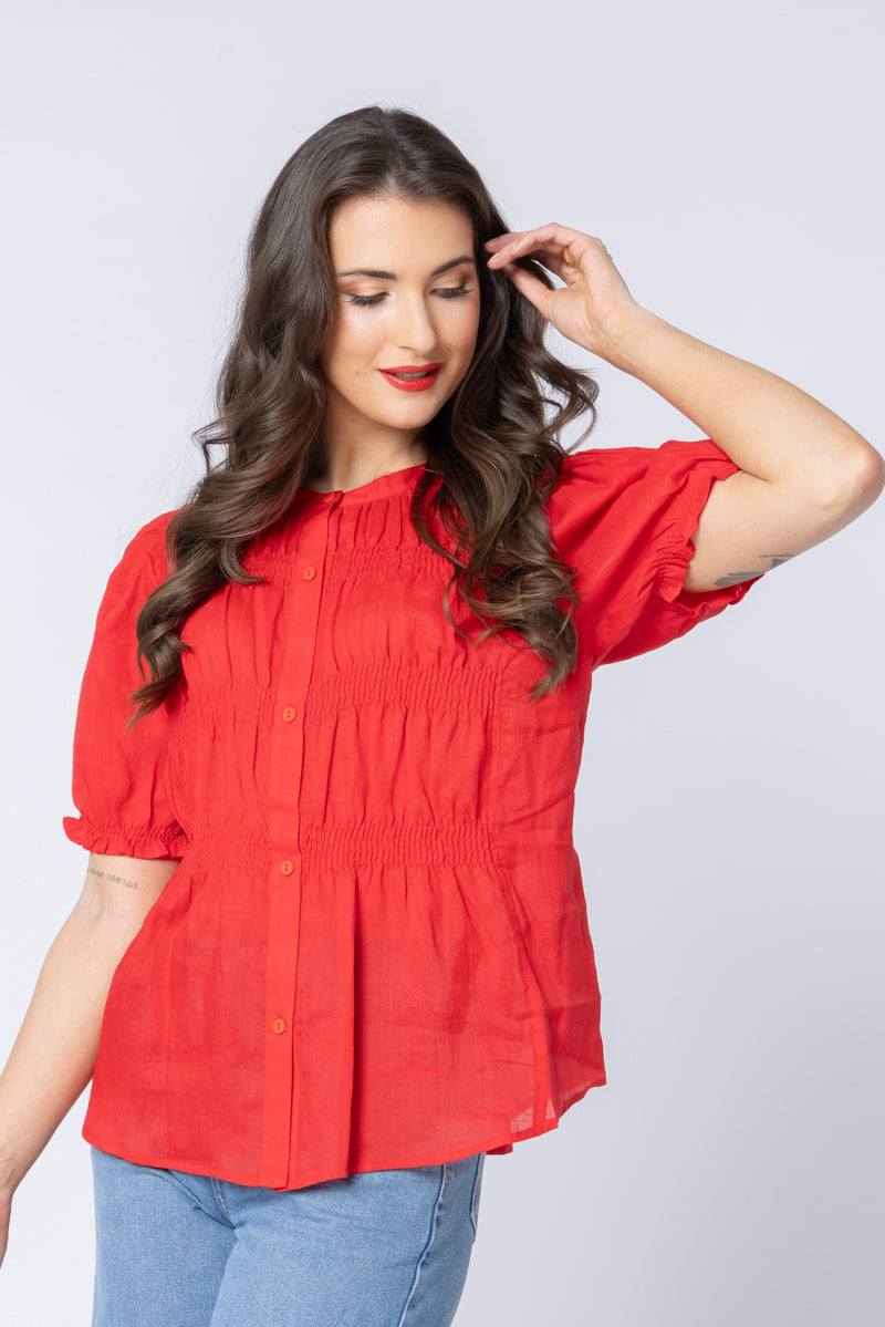 The Bonita Top features intricate design elements that create a flattering silhouette. The front is adorned with detailed pin-tucking and ruching across the bodice, which softly defines the waistline before flowing into a relaxed peplum-like hem. It has a neat mandarin/band collar and a full button-front placket for versatility. The short sleeves are gathered for a romantic, airy puff effect ending in a delicate ruffled cuff.