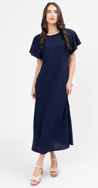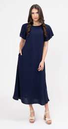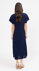 Embrace effortless elegance with the Seeking Lola Flutter Dress in classic Navy. This chic and versatile midi dress is designed to be a comfortable and stylish staple in your wardrobe. The dress is made from a lightweight and breathable fabric that drapes beautifully, creating a relaxed and graceful silhouette.