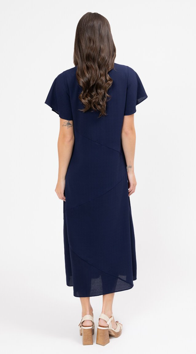 The Flutter Dress features a classic round neckline and short, flowing flutter sleeves that add a touch of feminine charm and movement. The A-line midi skirt is detailed with subtle diagonal seam lines, giving it a modern, geometric feel. This design adds a unique element to the dress while maintaining its simple and sophisticated look.