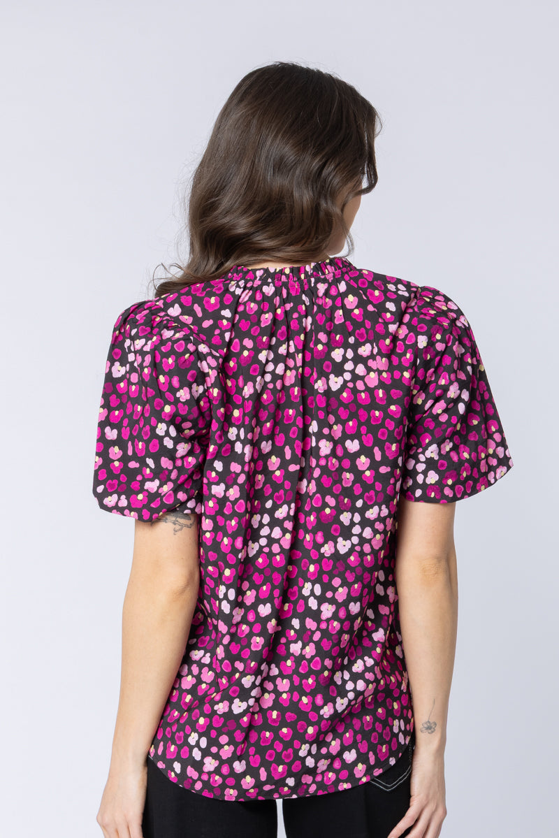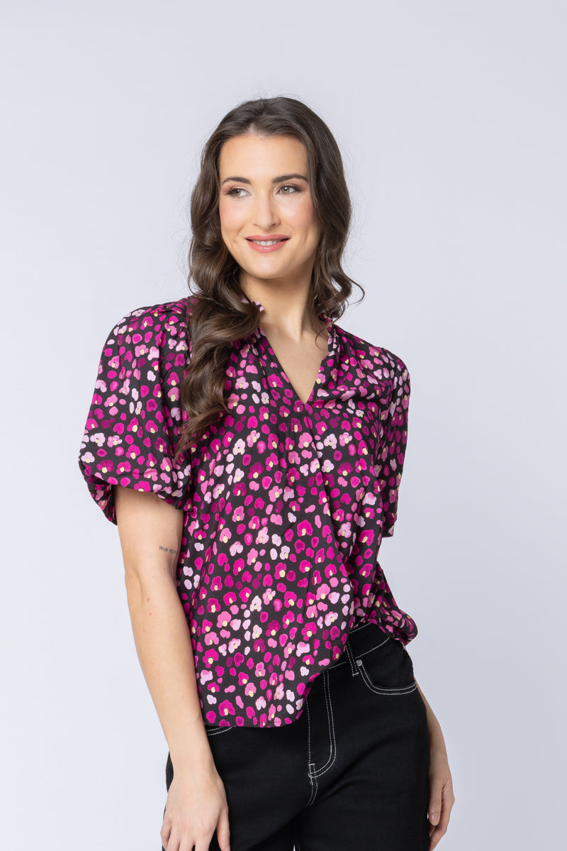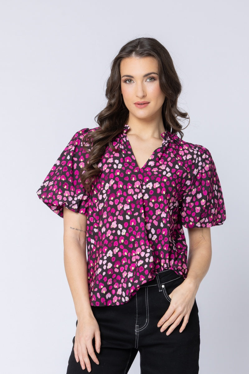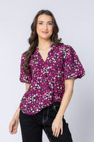 Get ready to shine in the Seeking Lola Treasure Top in the eye-catching Periwinkle print. This top features a playful, modern abstract spot pattern set against a deep black background, bursting with electric fuchsia, bright pink, and soft lavender tones. It's the perfect piece to inject energy into your wardrobe!