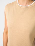 What sets this piece apart is the sophisticated detail: a subtle contrast tipping trim in white accents the neckline and hem, adding a crisp, clean border to the neutral Oat colour.