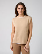 The Jenni Vest features a timeless silhouette with a comfortable crew neck. The main body uses a smooth jersey knit, giving it a refined drape, while the neck and hem are finished with rib trims.