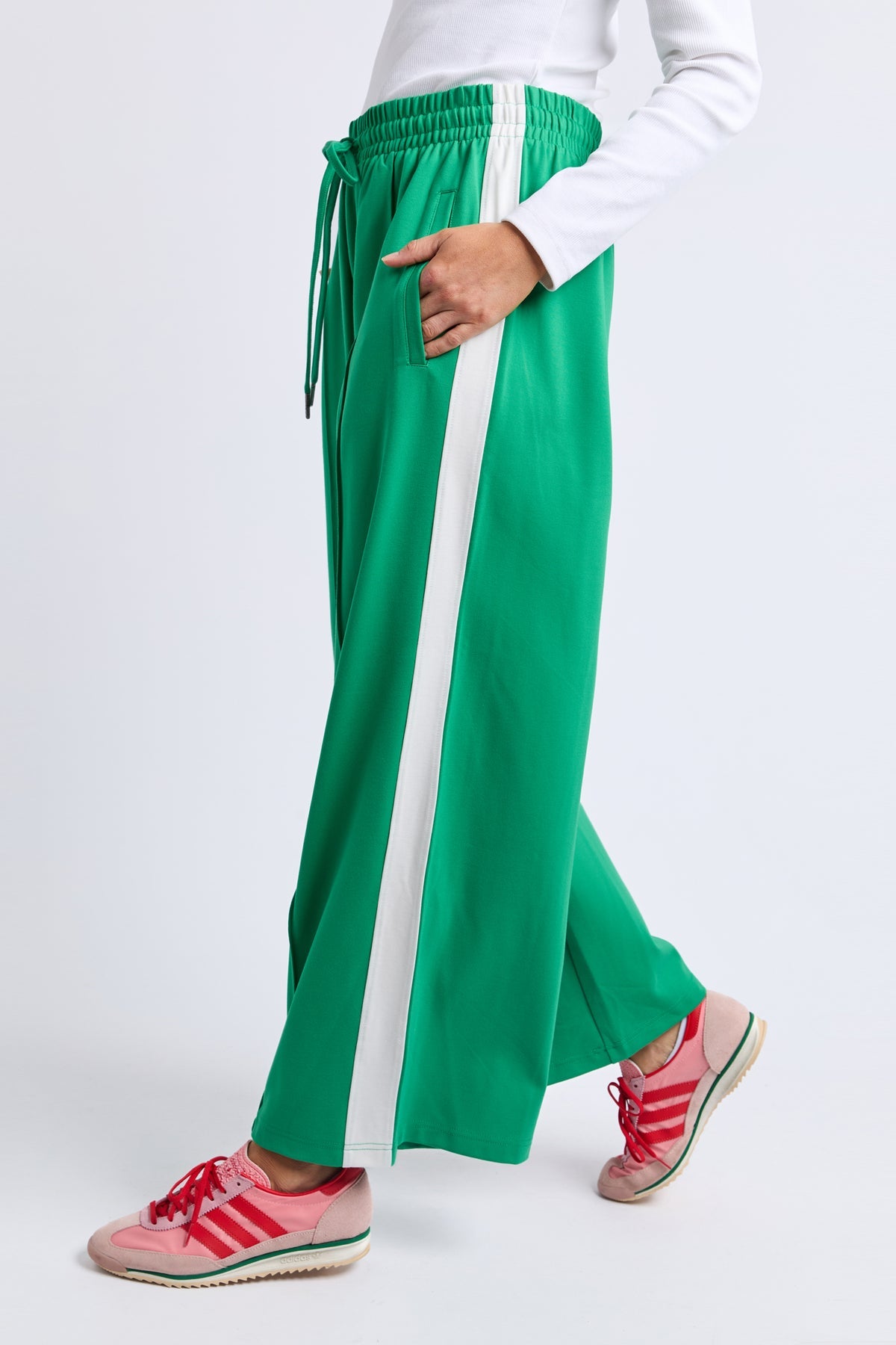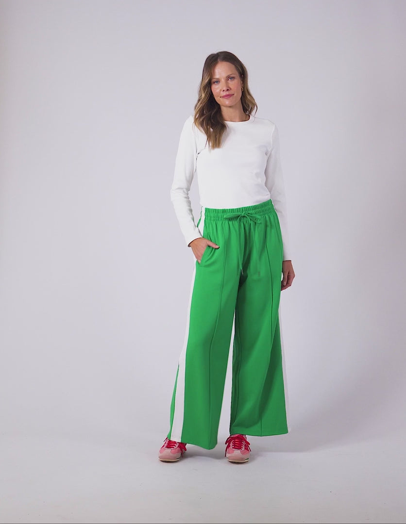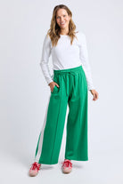 You will never want to take these pants off! The Elm Carmen Wide Leg Pant in Pine Green offers the perfect combination of comfort, style, and a sporty-luxe feel. The bold pine green colour is complemented by a striking white stripe down the side, creating a dynamic and fashionable look.