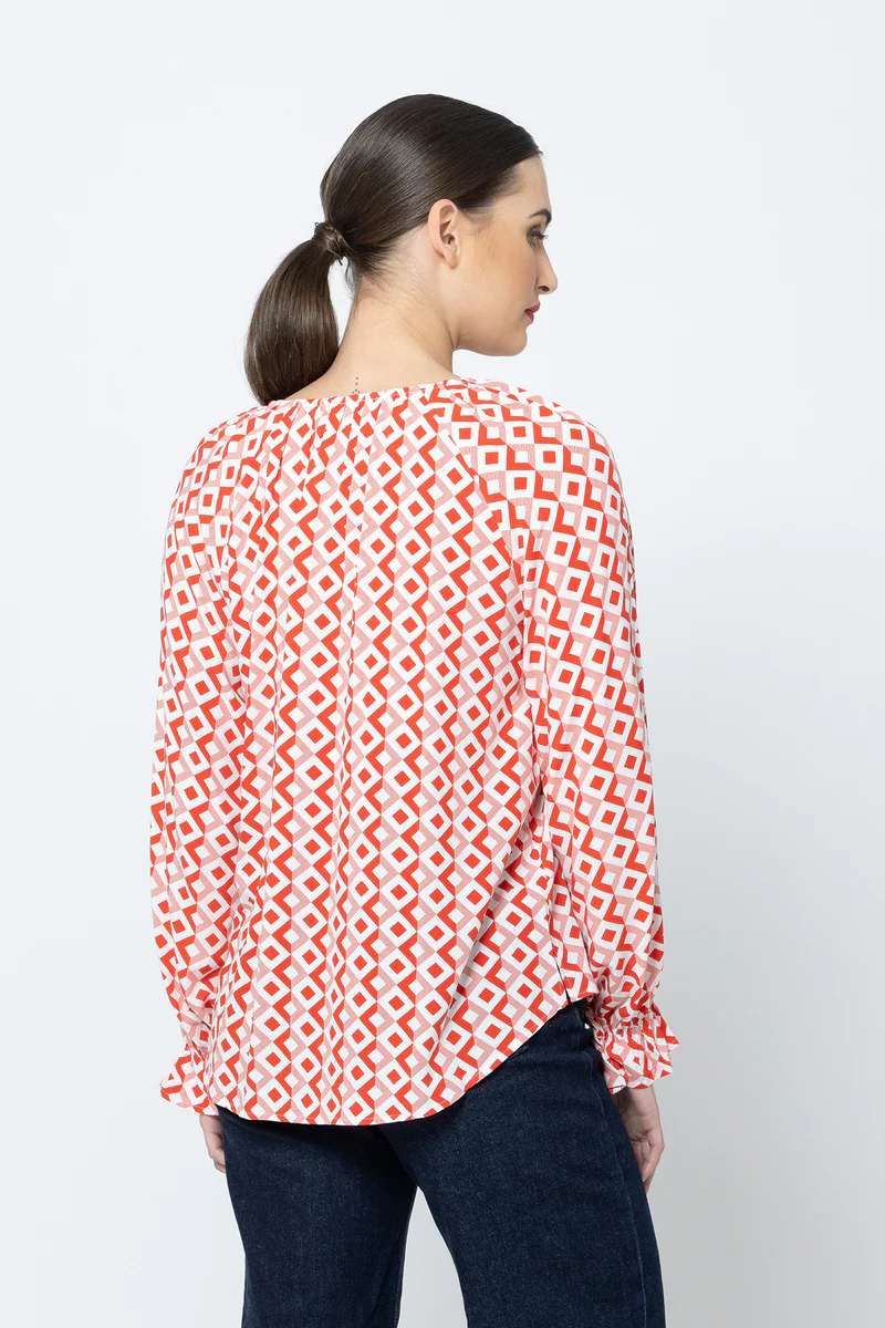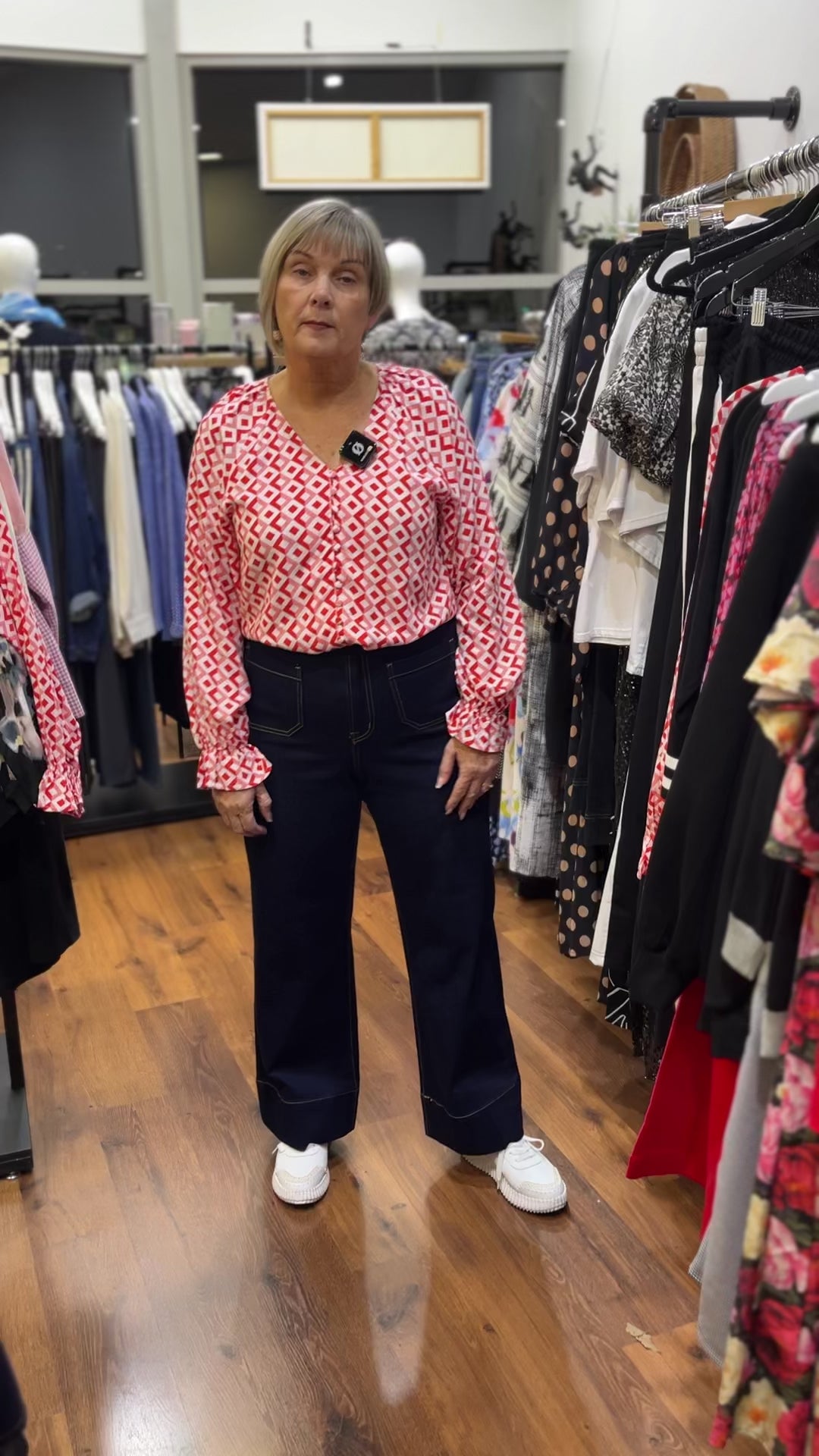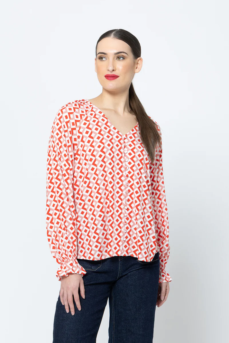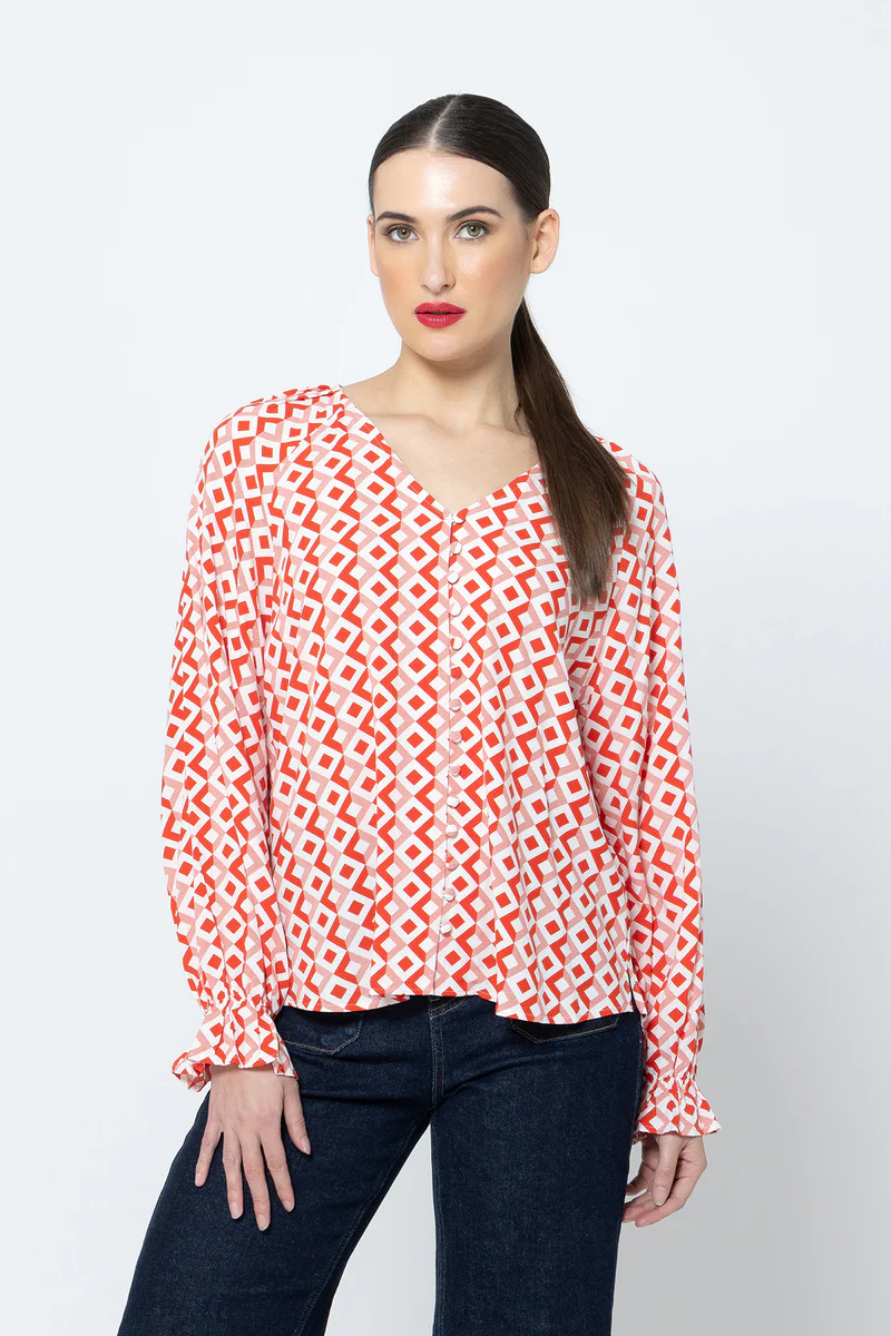 This stylish long sleeve top features a vibrant red and white geometric pattern that adds a contemporary flair to any wardrobe. The v-neckline enhances the feminine silhouette, while the button detail adds a touch of sophistication. Additionally, the elastic frill cuffs provide a playful element