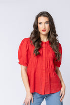 The Bonita Top features intricate design elements that create a flattering silhouette. The front is adorned with detailed pin-tucking and ruching across the bodice, which softly defines the waistline before flowing into a relaxed peplum-like hem. It has a neat mandarin/band collar and a full button-front placket for versatility. The short sleeves are gathered for a romantic, airy puff effect ending in a delicate ruffled cuff.