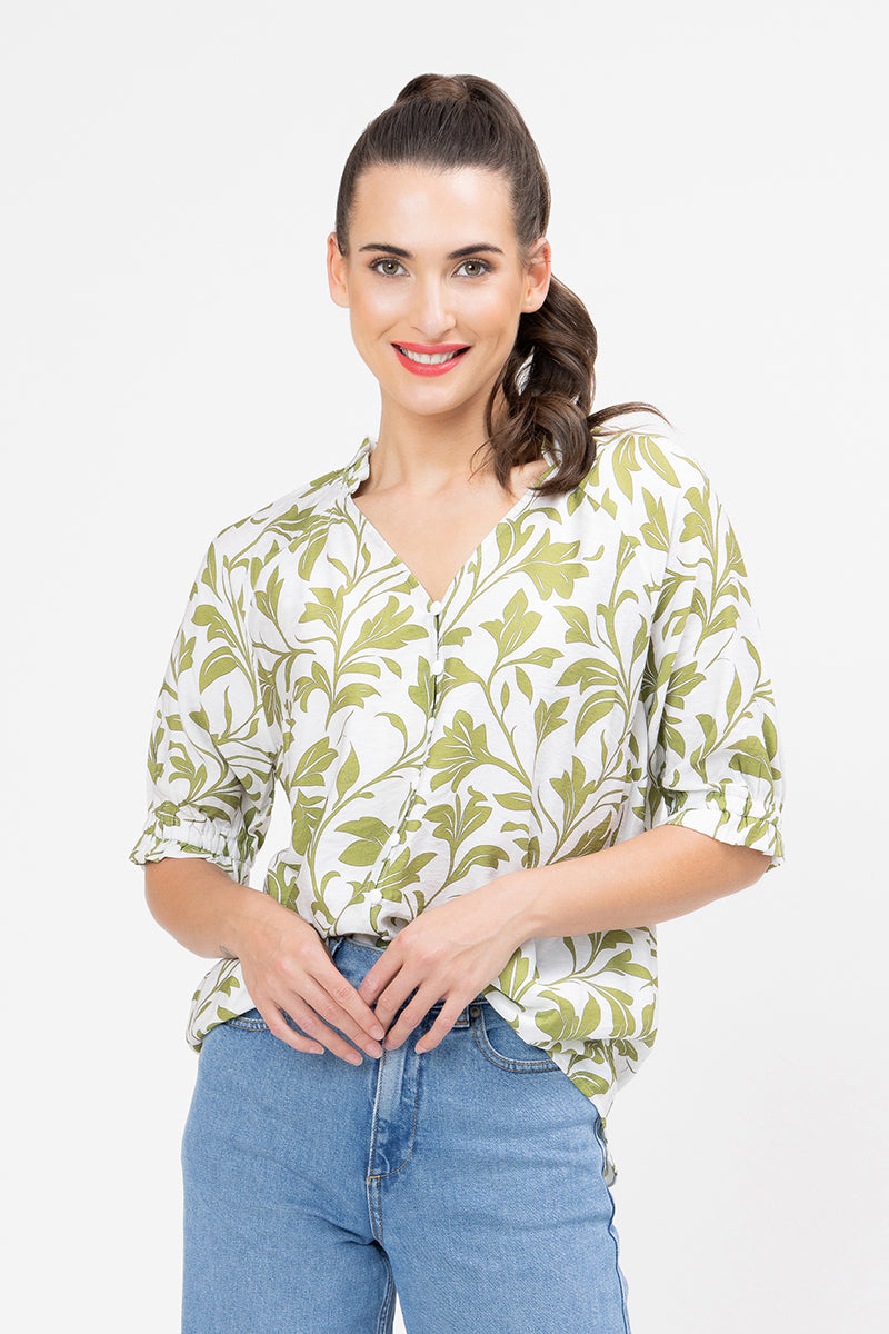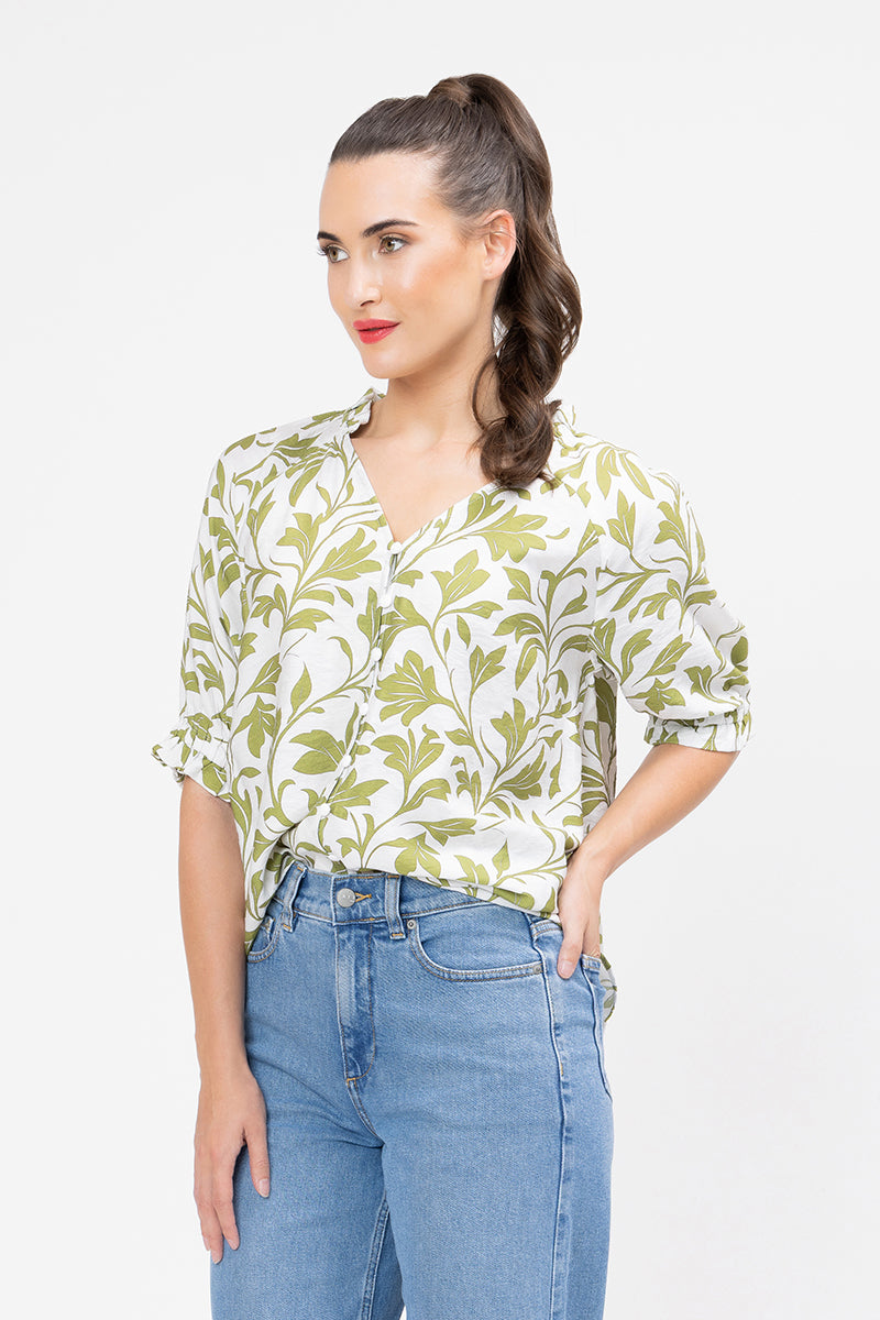 This top pairs perfectly with your favourite denim for a casual, stylish ensemble (as pictured). For a smarter look, tuck it into tailored trousers or a crisp white skirt. The Olive Stem print coordinates effortlessly with neutrals, denim, and even rich jewel tones.