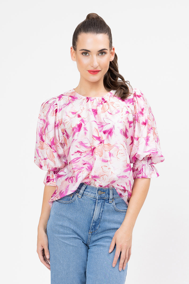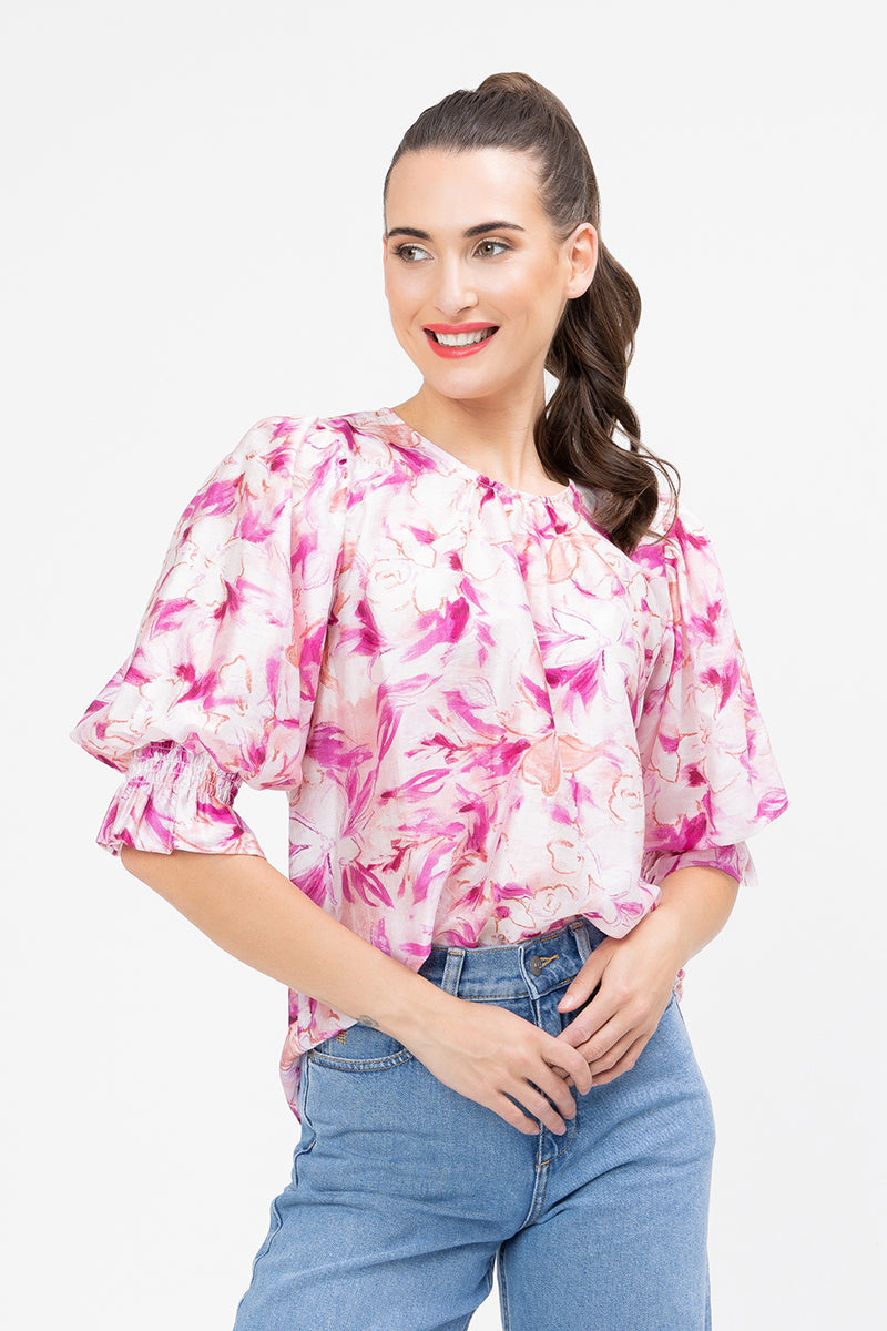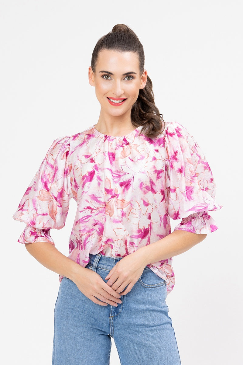 The "Pink Splash" print features an artistic, watercolor-like design with bold strokes of fuchsia, rose, and soft peach on a creamy background. The top has a sophisticated round neckline and a relaxed fit through the body. Its most magnificent feature is the three-quarter length puff sleeves, which are cinched with a ruffled, elasticated cuff, adding a touch of romantic drama.
