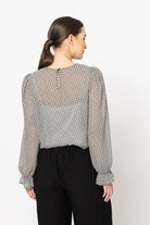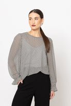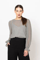 Beautiful shape top featuring a long sleeve with a frill at the cuff a round neck with button opening, simple and stunning.
