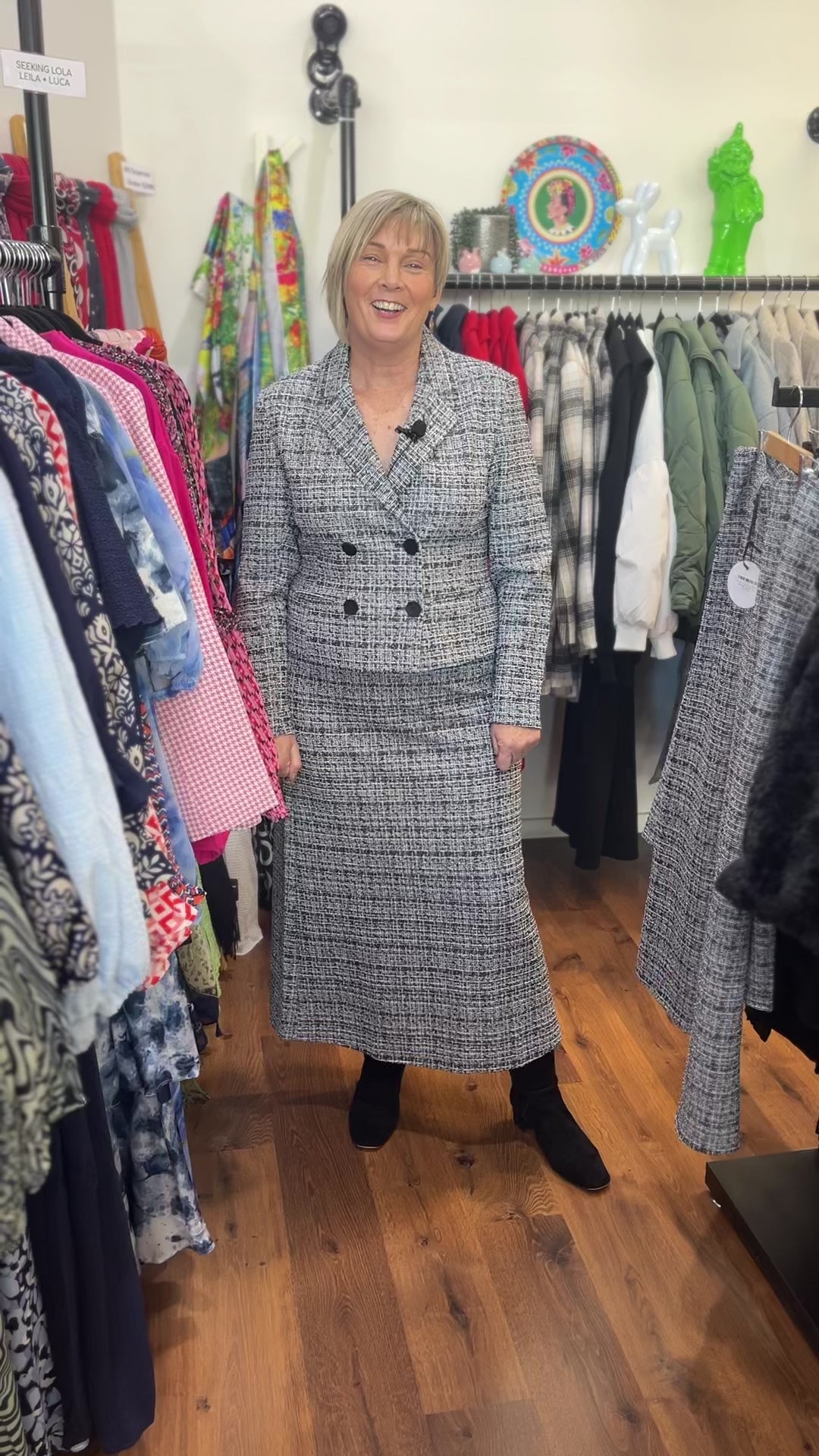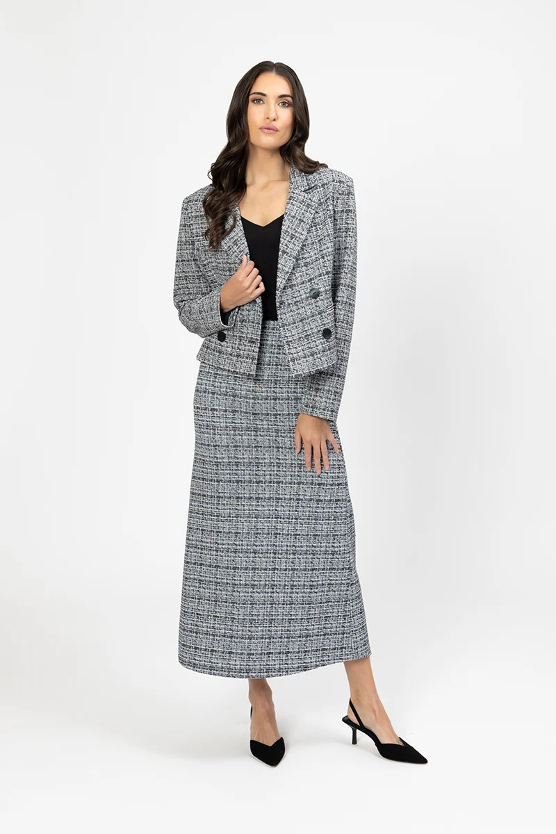 This sophisticated grey and white checked tweed suit is designed for the modern individual who appreciates both style and comfort. The fit and flare silhouette accentuates the waist while providing a flattering shape that moves gracefully with the wearer. Featuring a back split vent at the hem, this suit allows for ease of movement, making it perfect for both professional settings and social gatherings. The interior is fully lined, ensuring a smooth fit.