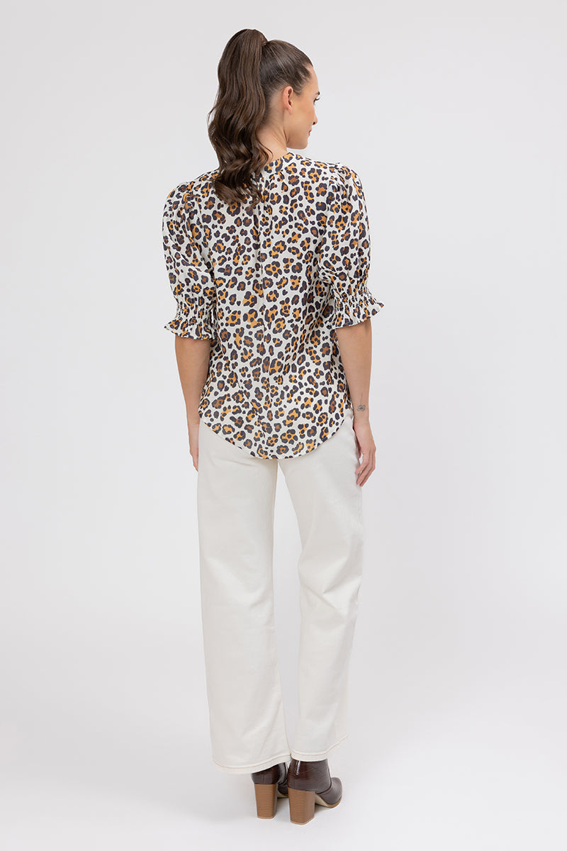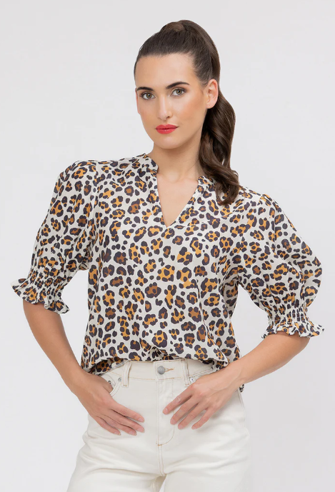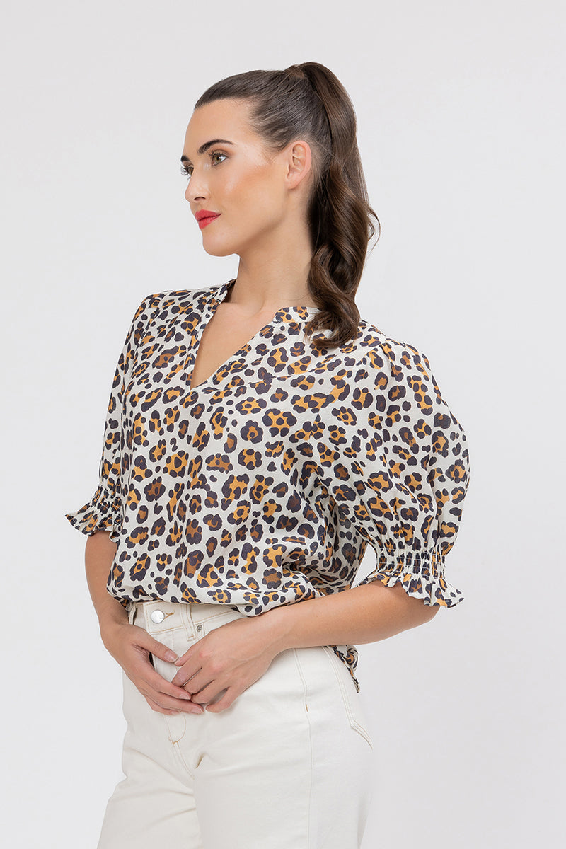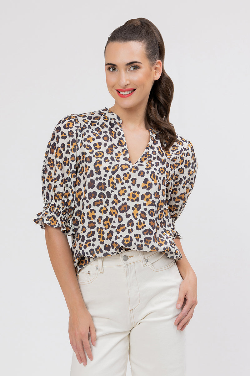 This blouse is the perfect way to incorporate a classic animal print into your wardrobe in a sophisticated, modern way. The print features a gorgeous mix of rich browns, warm golds, and black spots on a soft latte-toned background.