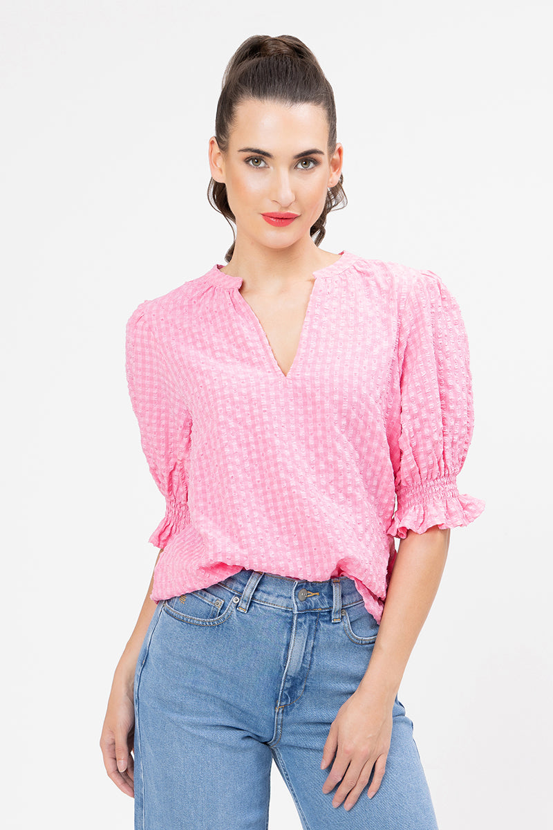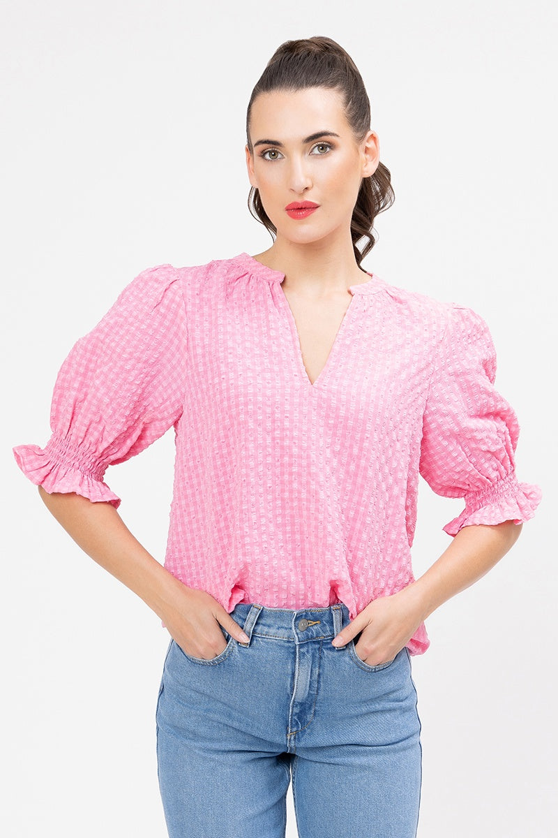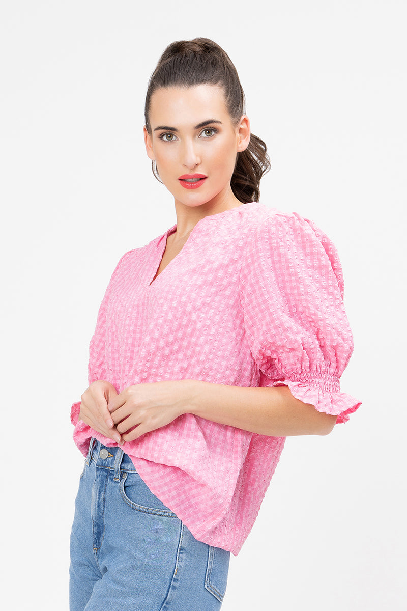 The "Lolly Check" pattern features a delightful textured check in a vibrant pink hue, adding a pop of color to your outfit. The top is designed with a flattering V-neckline and chic, semi-sheer puff sleeves that end in a ruffled, elasticated cuff. The relaxed "butterfly" silhouette provides an effortless and comfortable fit.