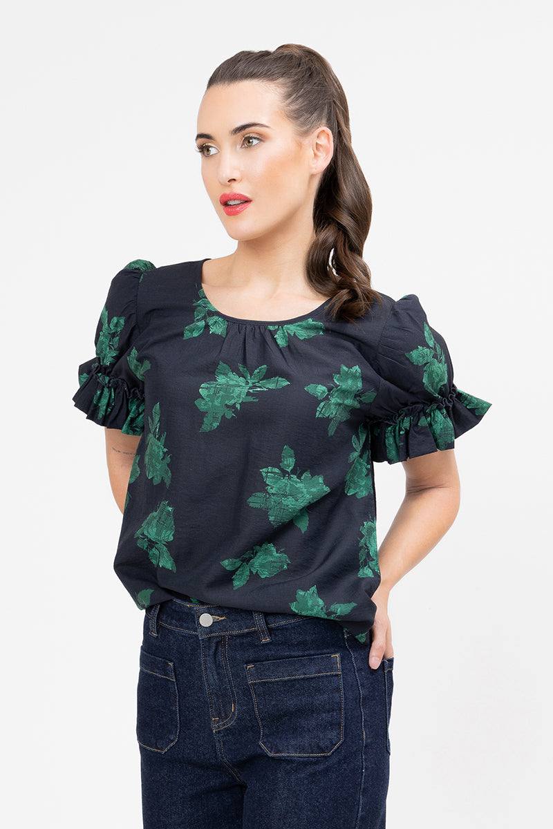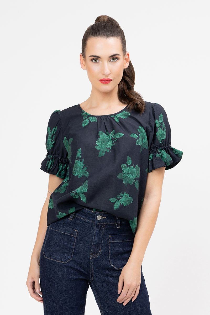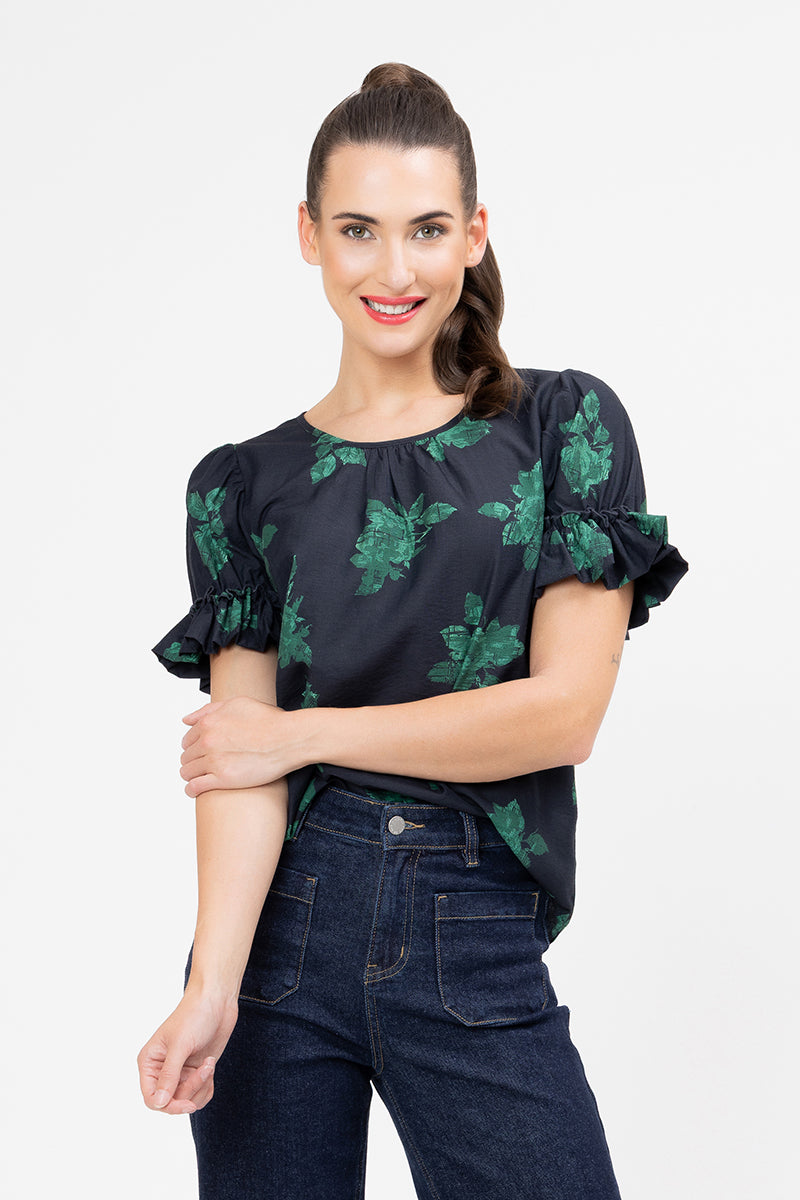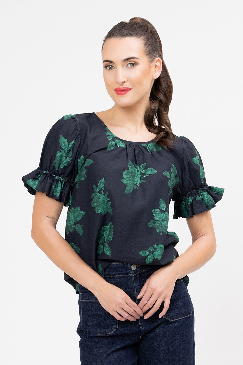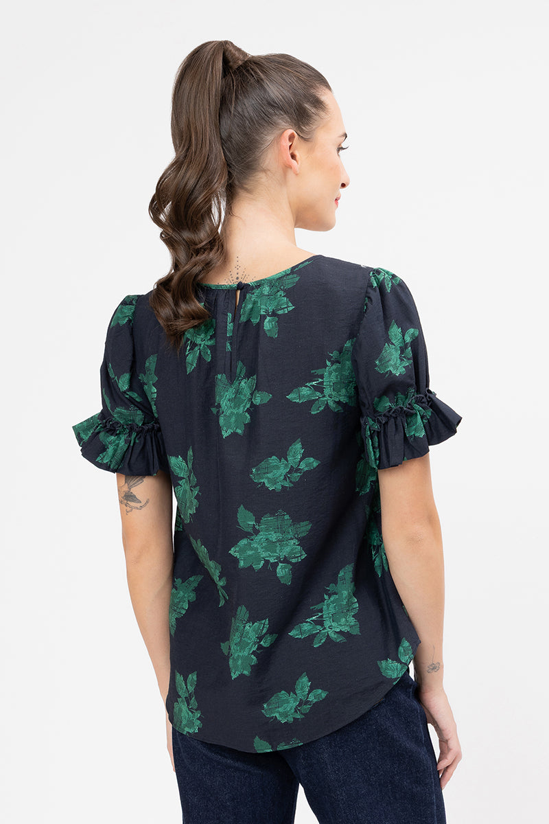 This top is the perfect piece to add a pop of colour and unique texture to your everyday look. It features a striking emerald green floral design set against a deep navy base, offering an elegant contrast that's both eye-catching and easy to style.