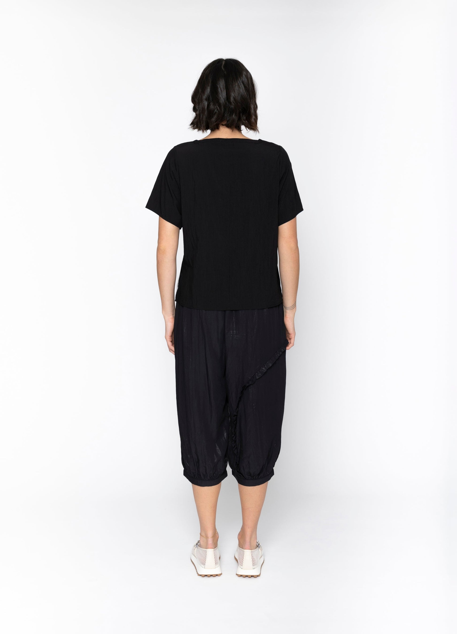 Meet the edgier twin of our popular tee: the Blacklist Dallas Top in Black with White Trim. This piece takes the comfort of a classic t-shirt and injects it with bold, contemporary style. Crafted from 100% breathable cotton, this black top is given an artistic edge with striking white architectural detailing across the front.