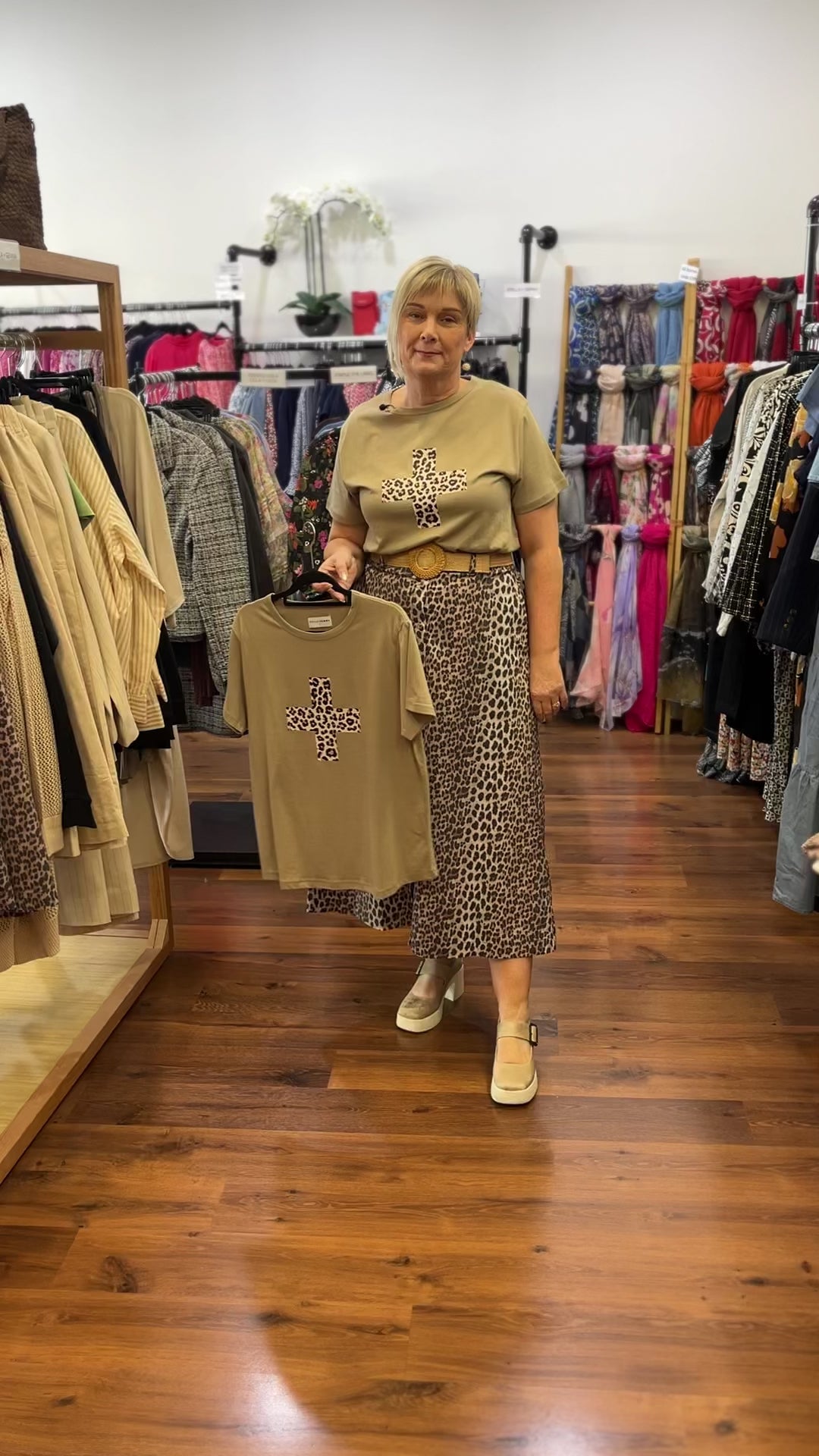 The Stella + Gemma Ace Tee is a stylish and versatile piece that combines a classic silhouette with a bold, modern print. This tee features a striking leopard print cross on the front, set against a soft sage-coloured background, adding a touch of edgy personality to your everyday look.