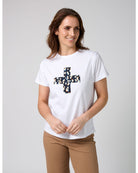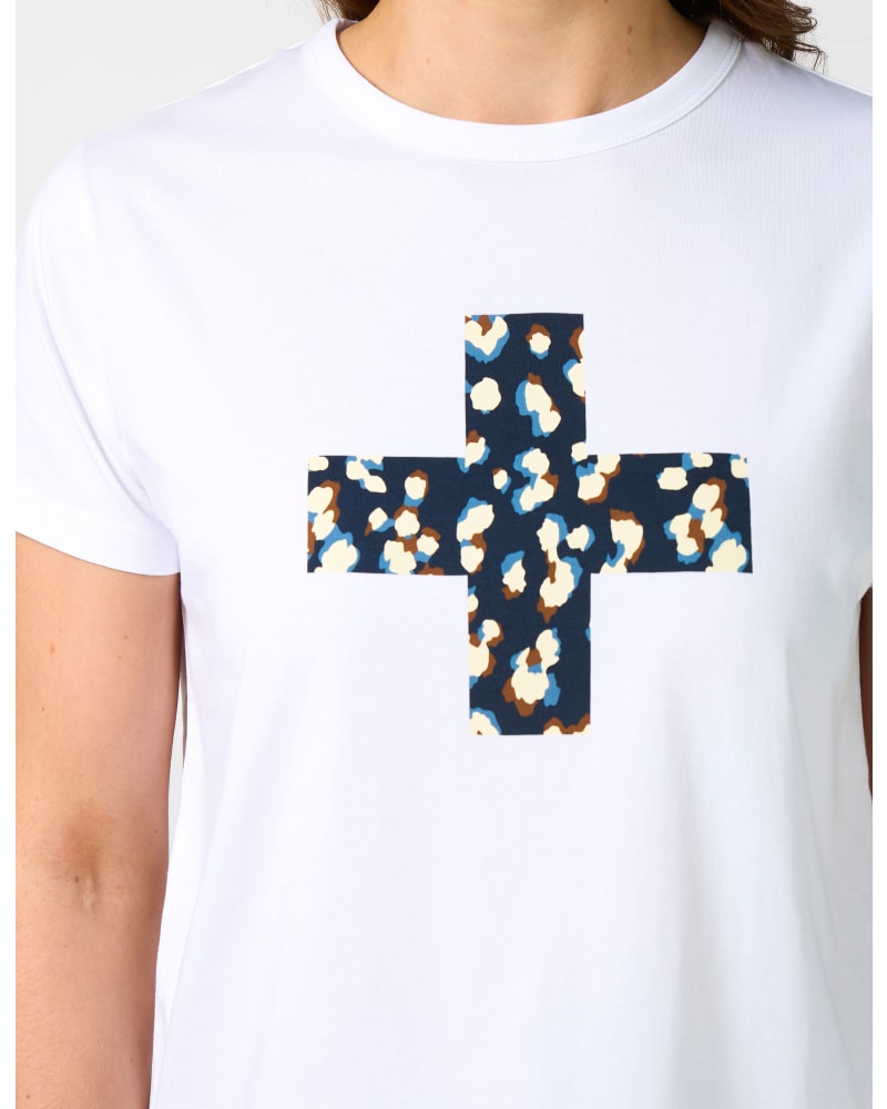 The Stella + Gemma Ace Tee is a stylish and versatile piece that combines a classic silhouette with a bold, modern print. This tee features a striking leopard print cross on the front, with a navy background and pops of blue, brown, and cream, set against a crisp white t-shirt. It adds a touch of edgy personality to your everyday look.