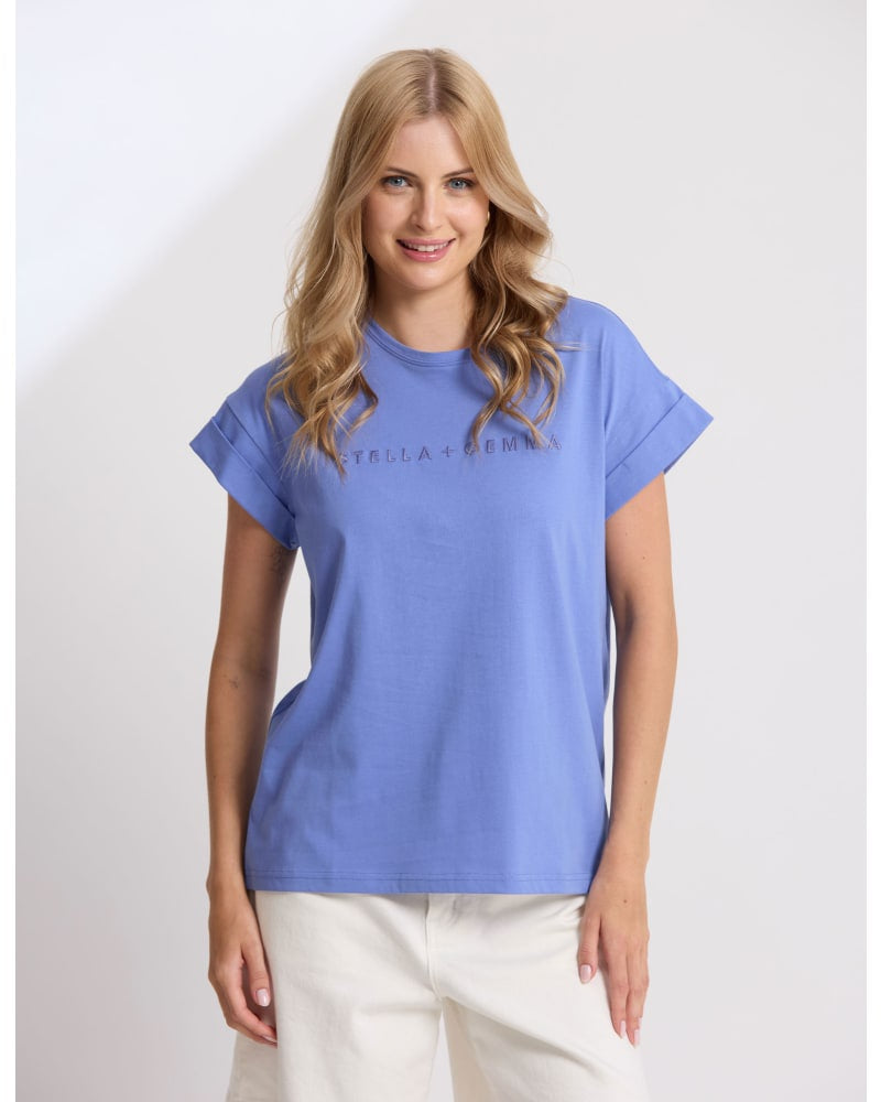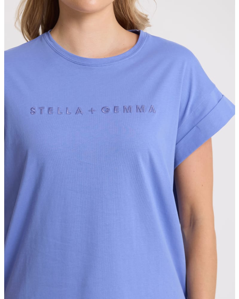 The front of the tee is subtly embroidered with the "STELLA + GEMMA" logo, a mark of quality and style. The Cornflower shade is a versatile and refreshing hue that will brighten up any outfit.
