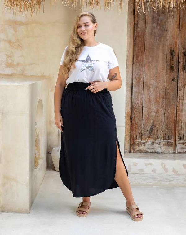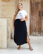 The Resort Skirt offers a flowing, full-length silhouette with a side split for added flair. Its high-rise, elastic waistband ensures a comfortable fit for all-day wear. Perfect for versatile styling, this skirt transitions smoothly from casual to elegant settings.
