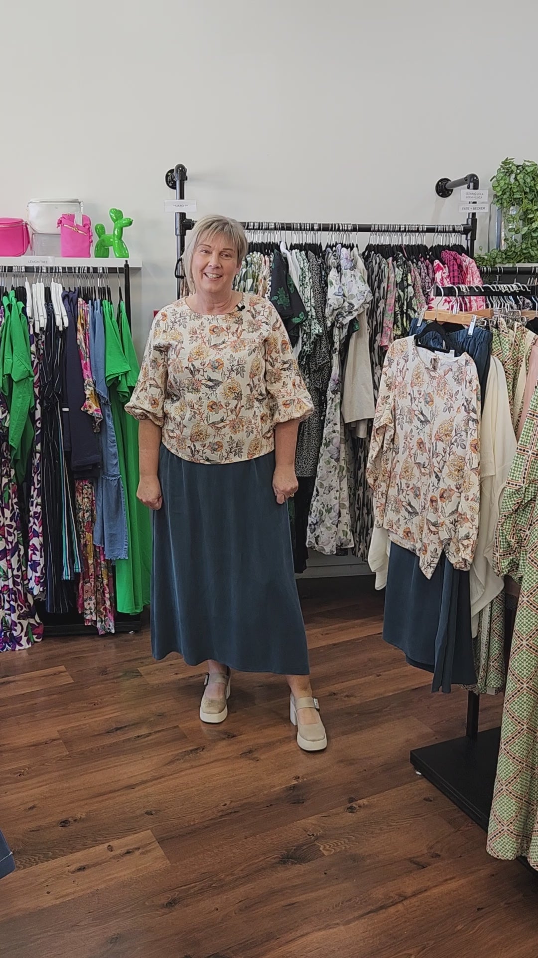 Jan wears the Misi skirt in navy (it is a teal blue).  Jan wears a size 12 in the skirt and is 164cm tall.  She wears the skirt with the Sia top (also available at Spoilt).