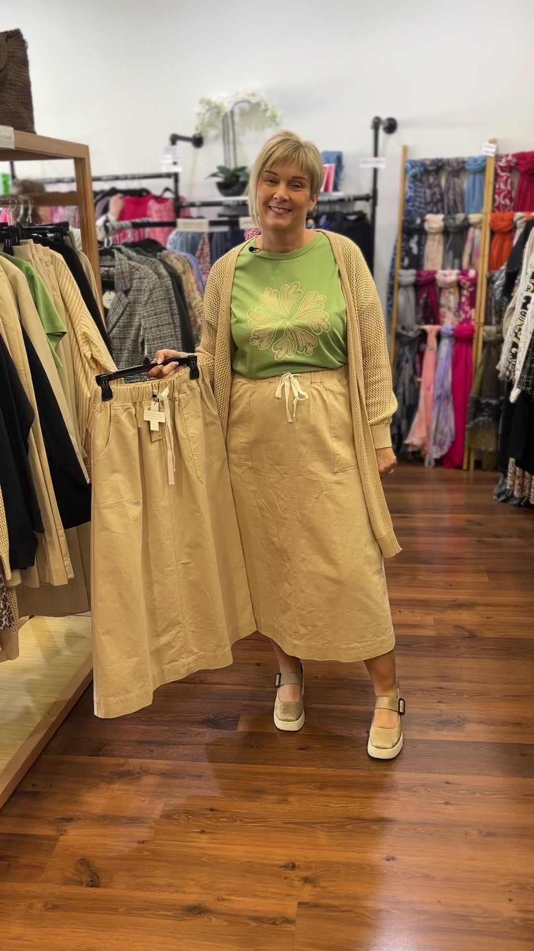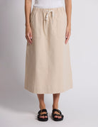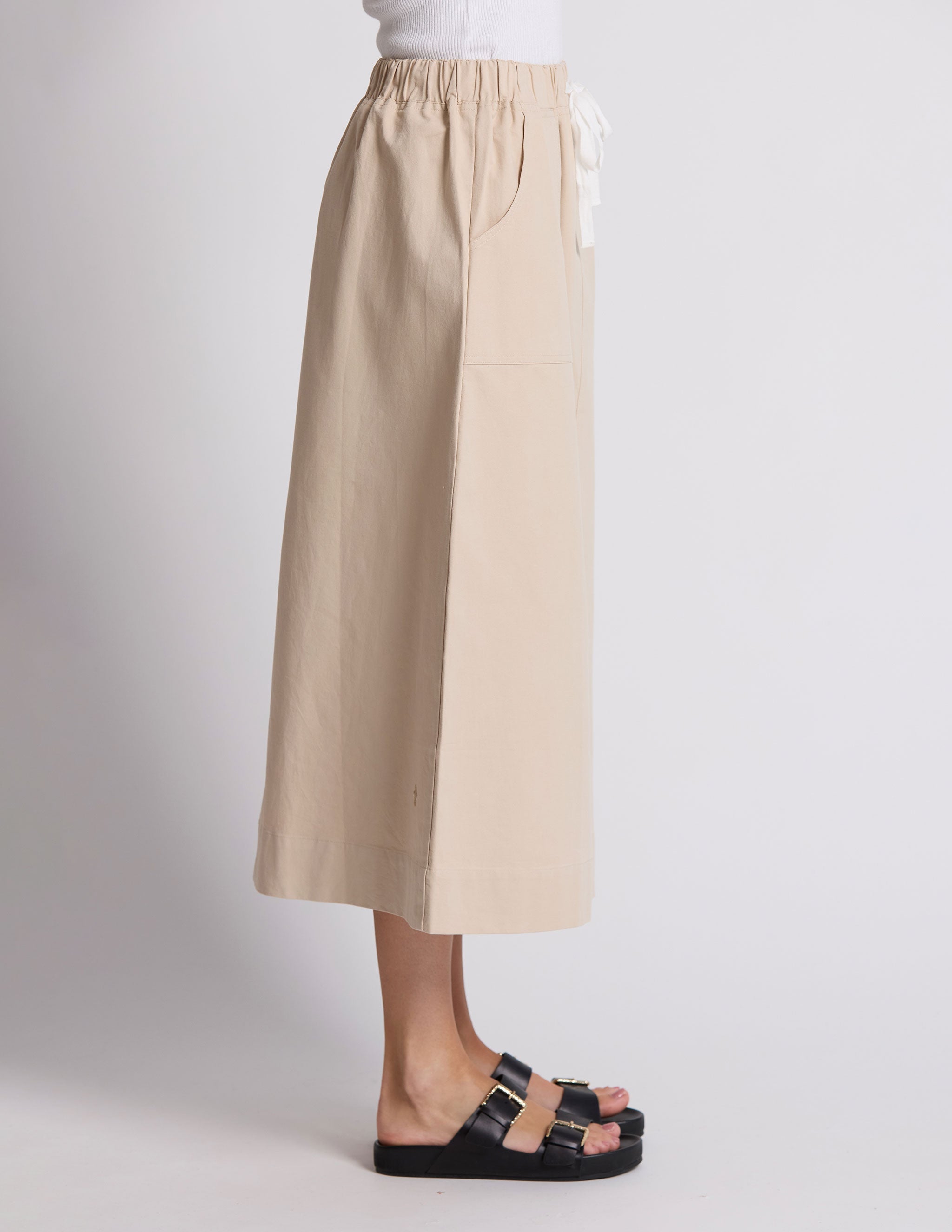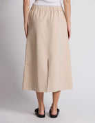 Midi length A-line skirt with centre front seam, centre back hem split and front patch pockets. Fully elasticated waist with contrast herringbone tie