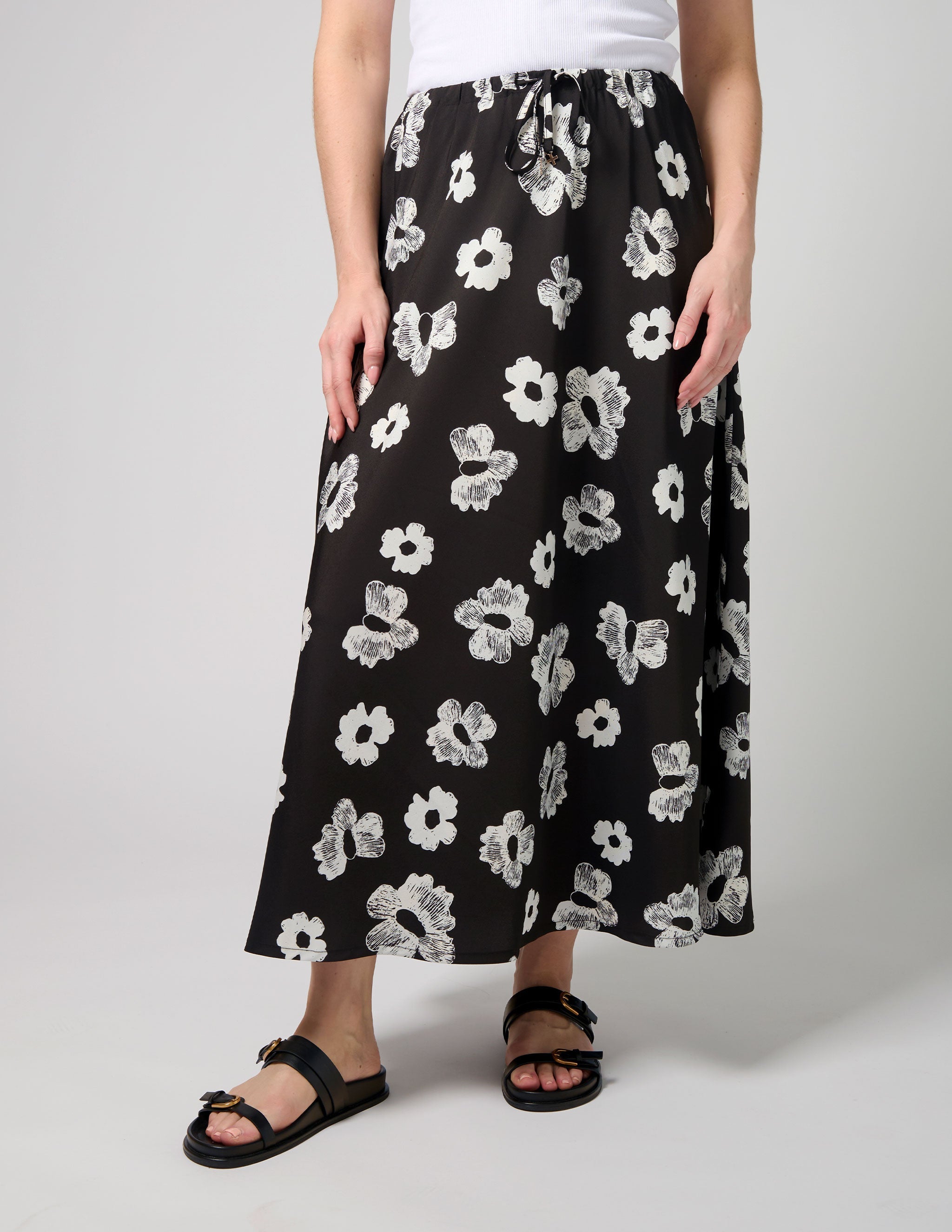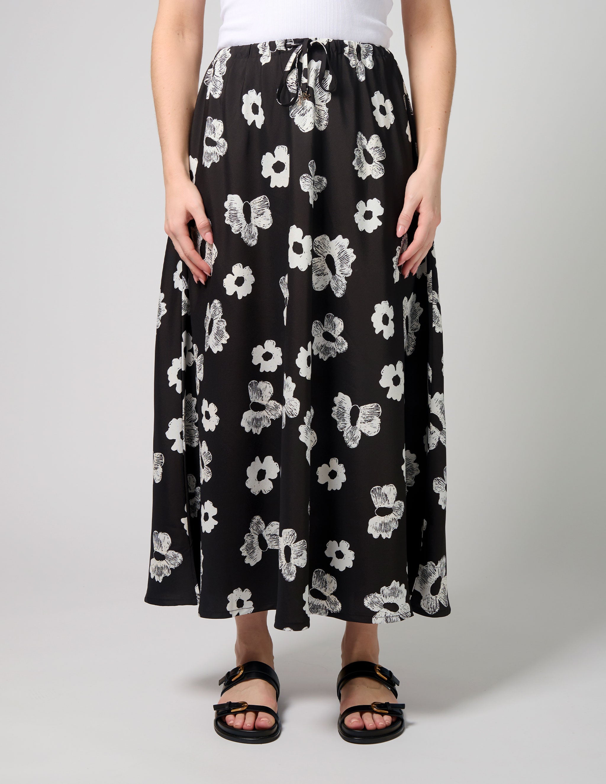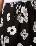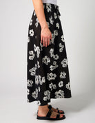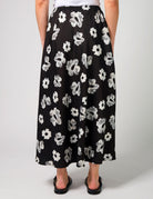 Make a statement with the Stella + Gemma Anastasia Skirt in Night Blooms. This beautiful ankle-length skirt features a striking black and white floral print, combining graphic and outlined flower designs for a modern and eye-catching look.