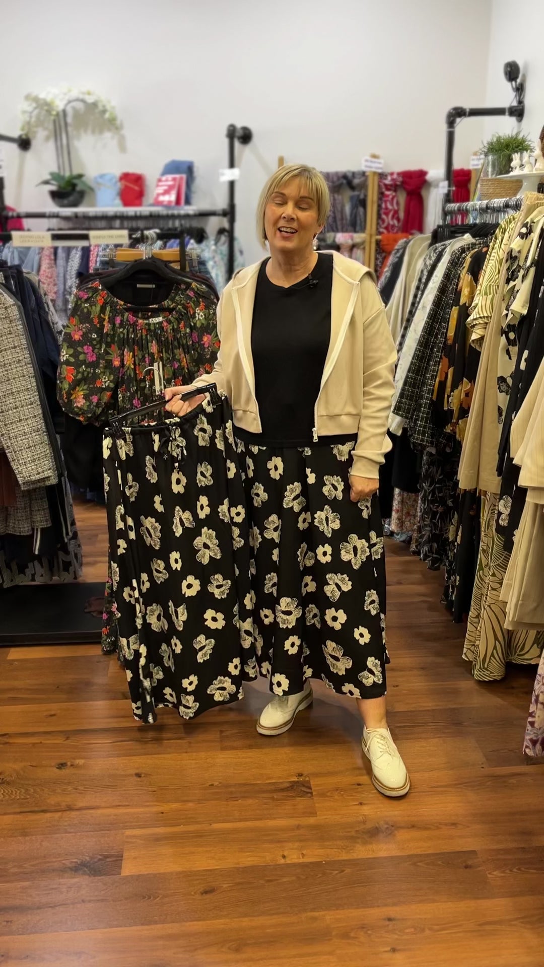 In our video Jan wears a size 12 her usual size (she is 164cm tall). Jan wears the skirt with the Homelee Emily Jacket and Homelee Becky knit tee