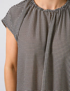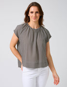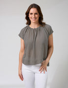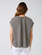 Designed with a relaxed fit, this blouse drapes beautifully, offering both comfort and style. The elasticated neckline creates a soft, gathered effect, while the keyhole split at the back neck adds a delicate detail. The short, cap sleeves provide a flattering finish.