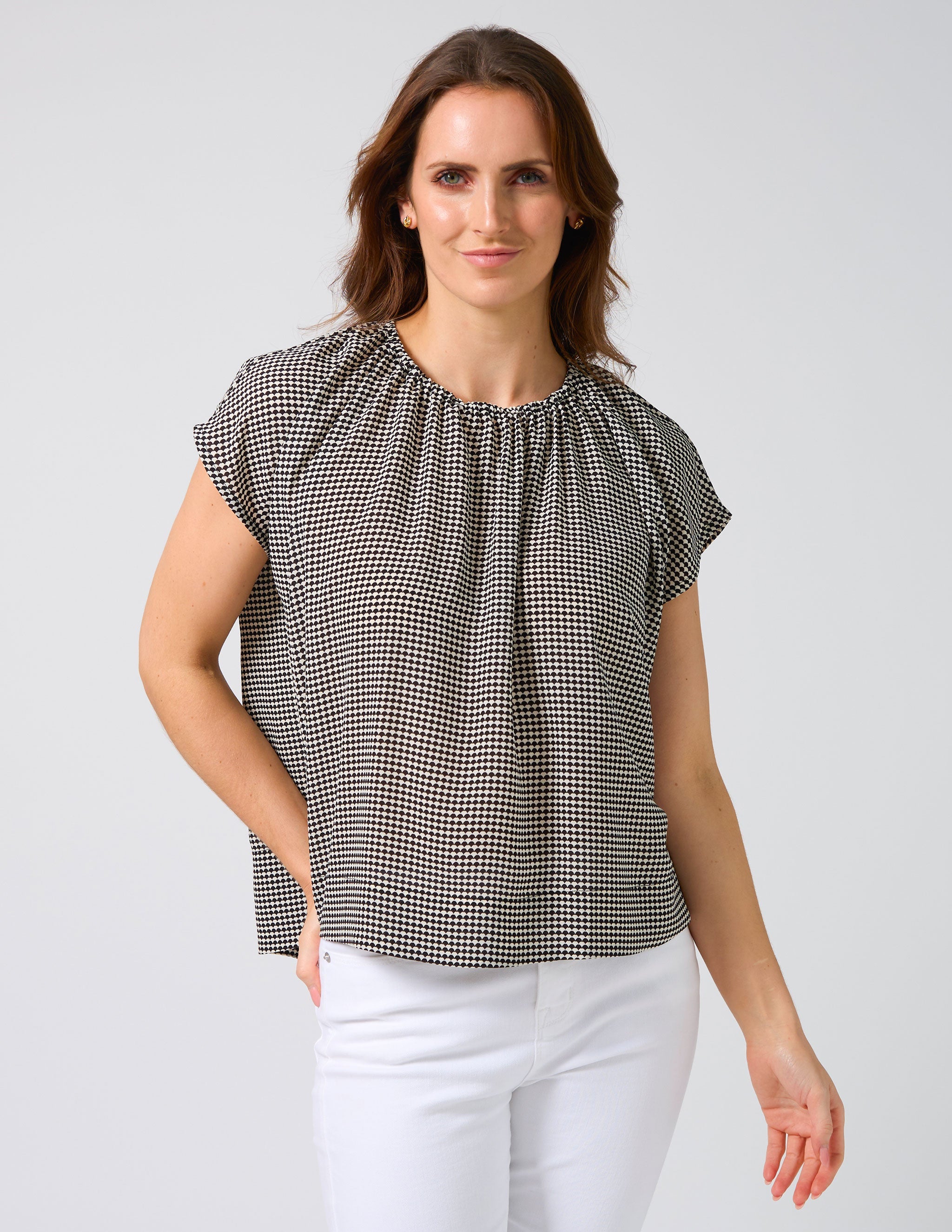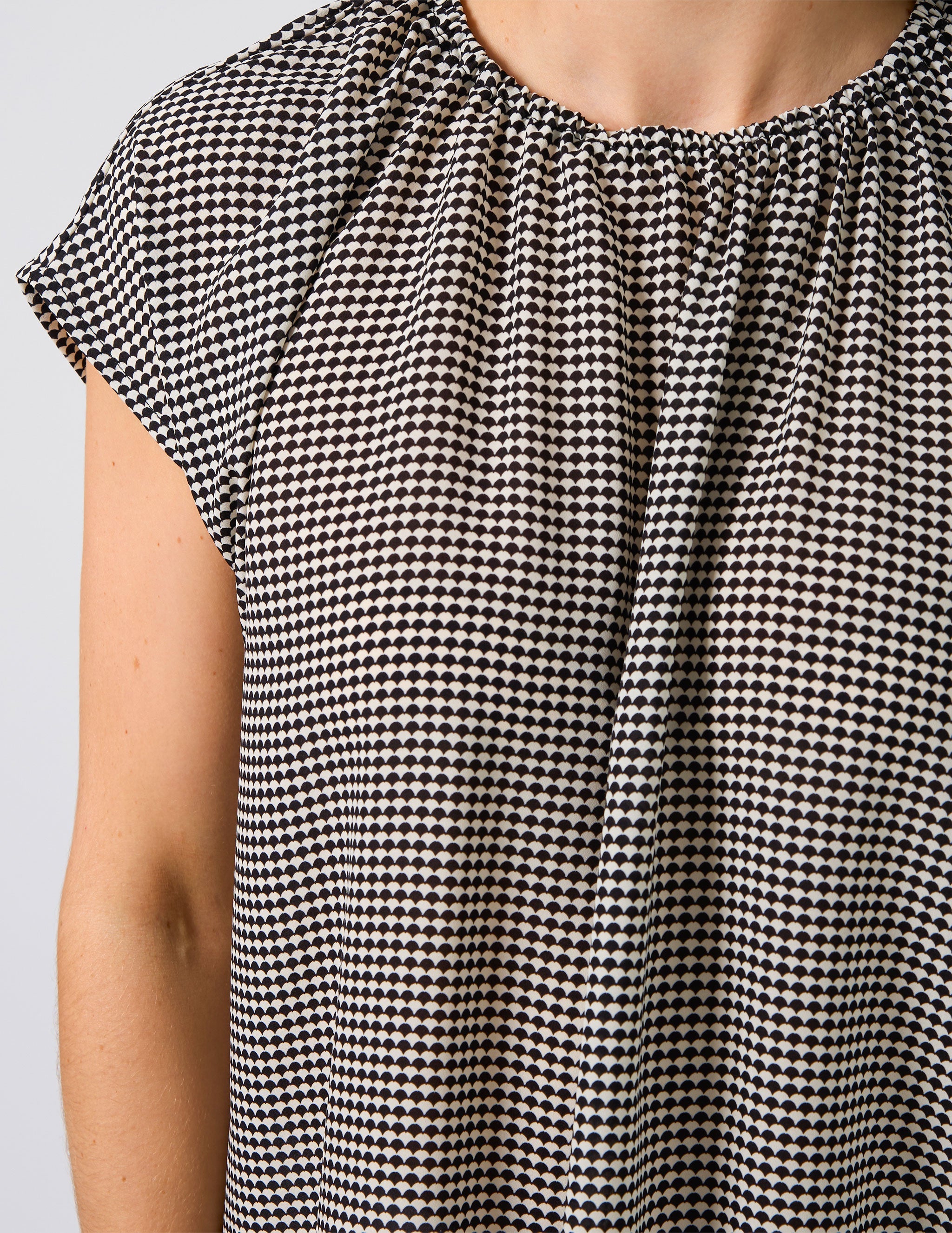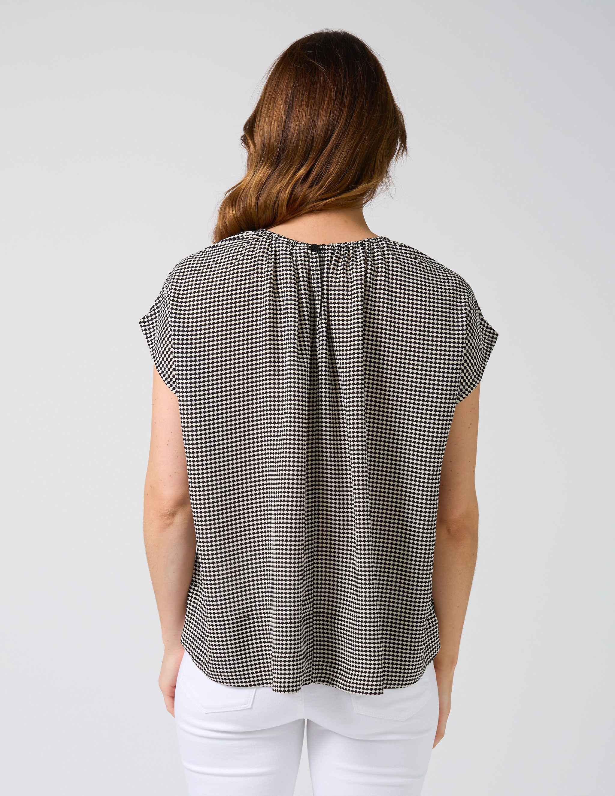 Effortlessly chic and easy to wear, the Stella + Gemma Clio Blouse in Fish Scale is a versatile piece for any season. The blouse features a subtle geometric "fish scale" print in a classic black and white colourway, making it a perfect match for a variety of bottoms.