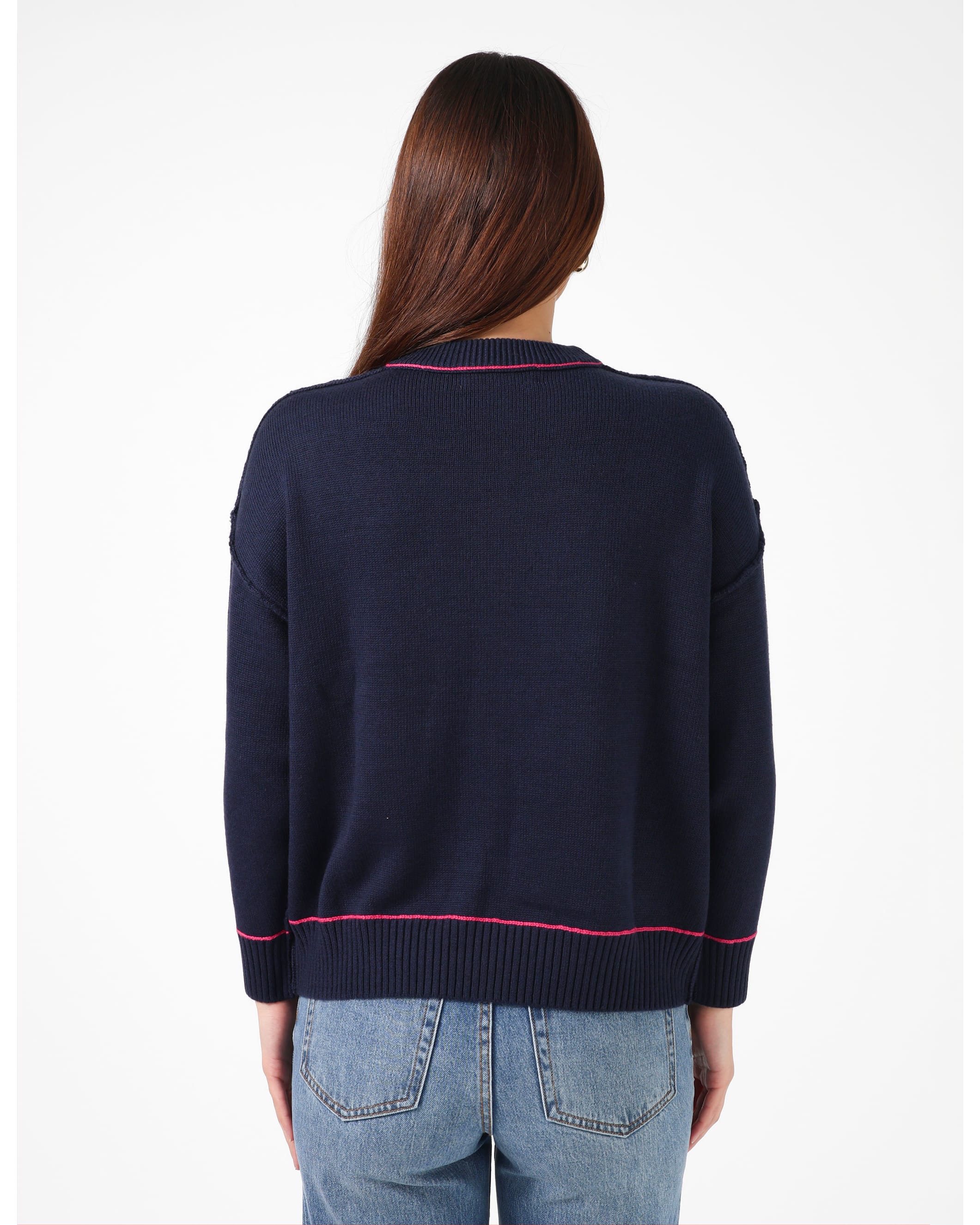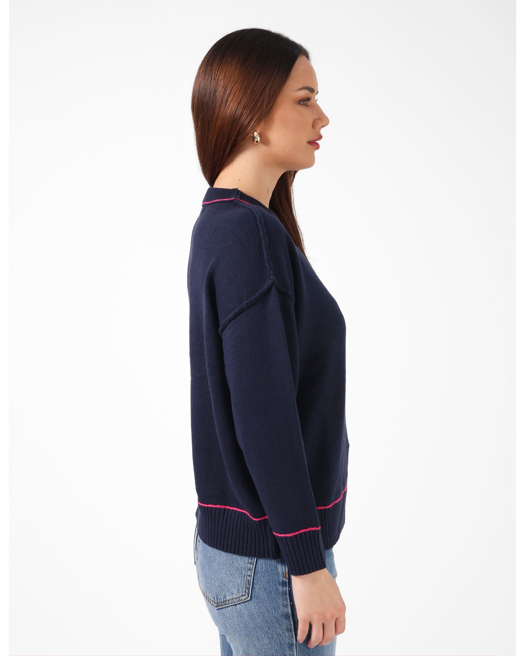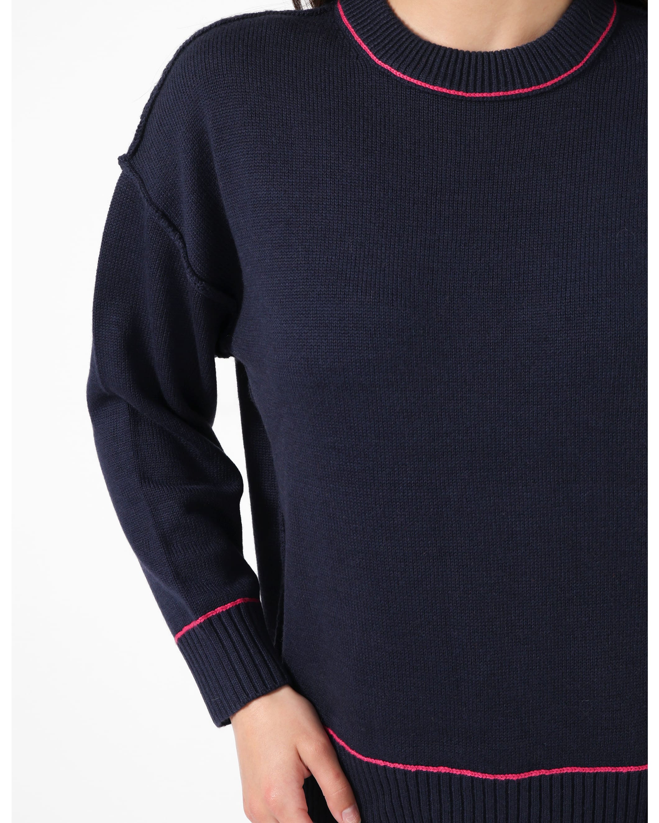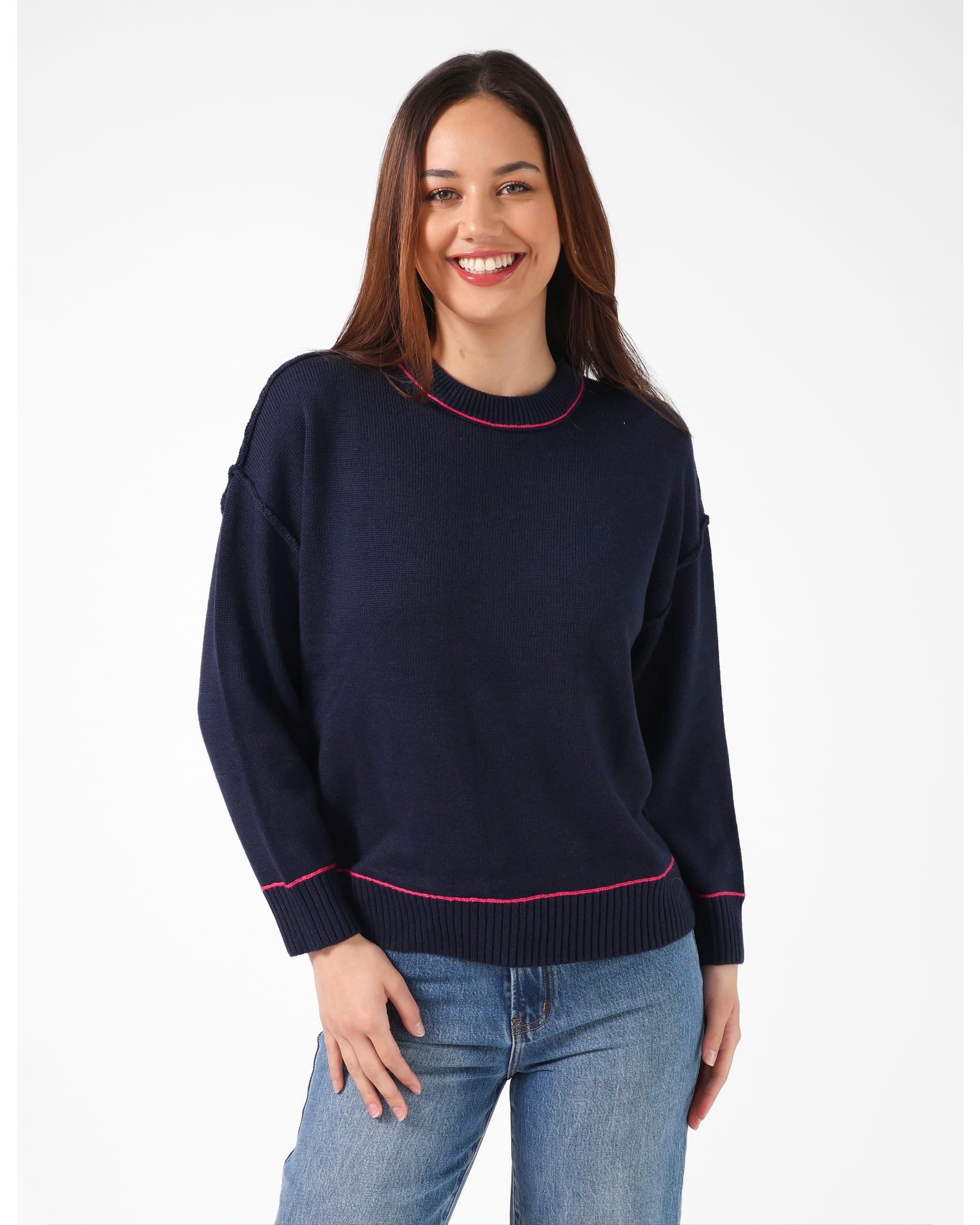 Relaxed fit crew neck knit in jersey knit with rib trims and contrast colour stitiching detail.