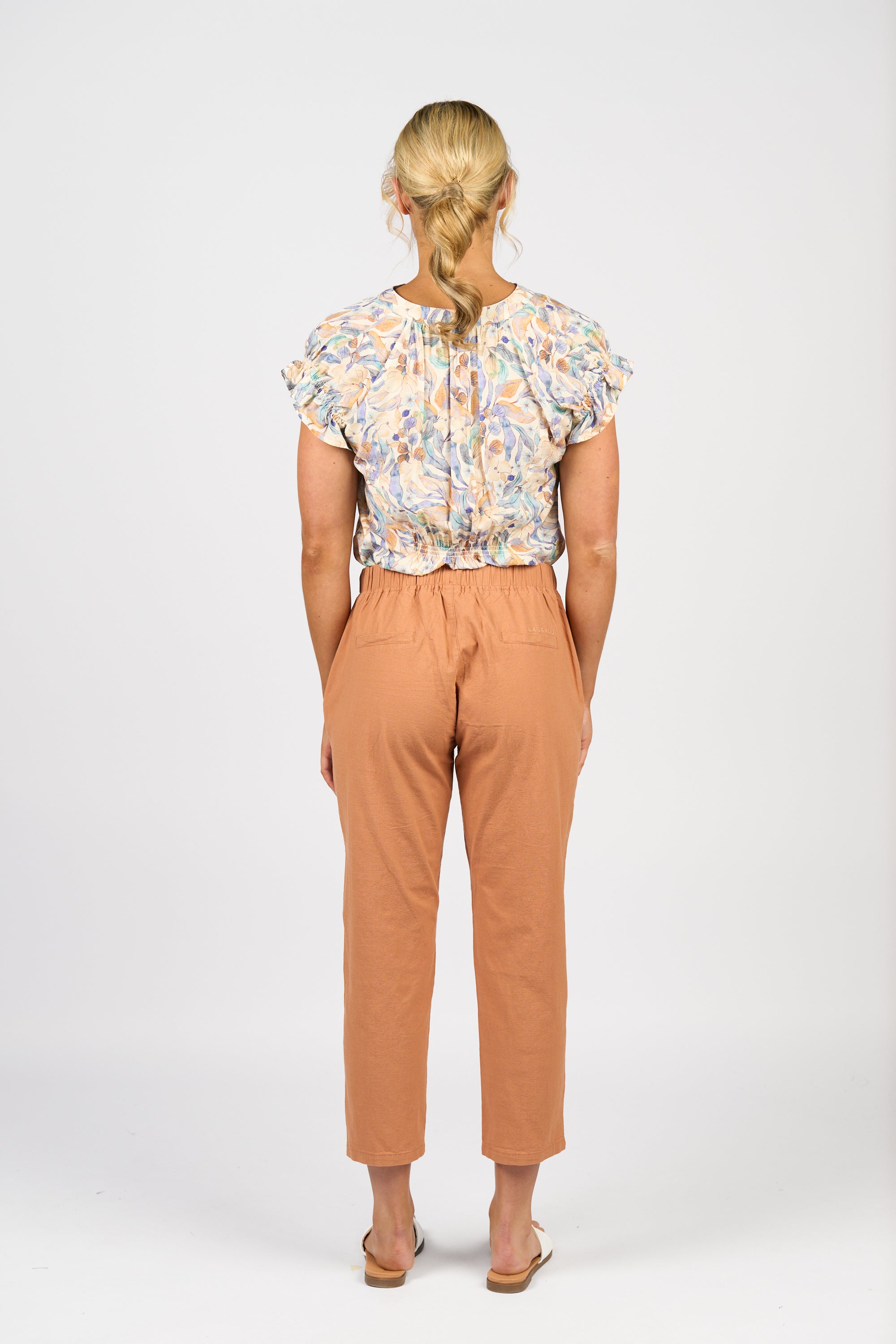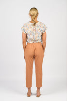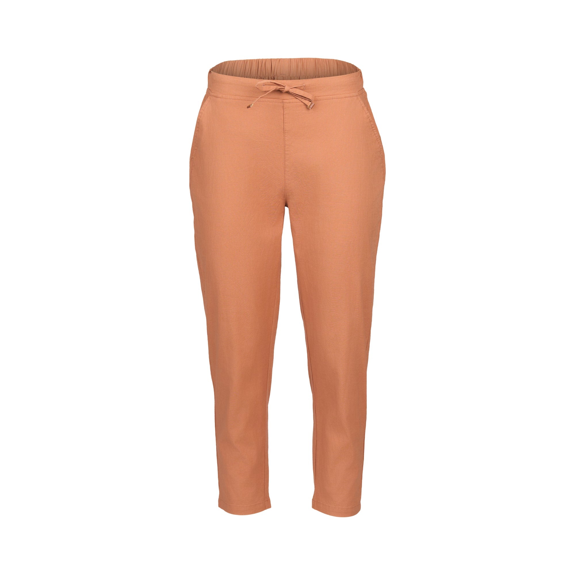 A 7/8 length skinny leg pant in spice, made from a soft cotton blend with added stretch for comfort. Featuring an elastic waistband with drawstring, angled front pockets, and faux back welt pockets for a more tailored finish.