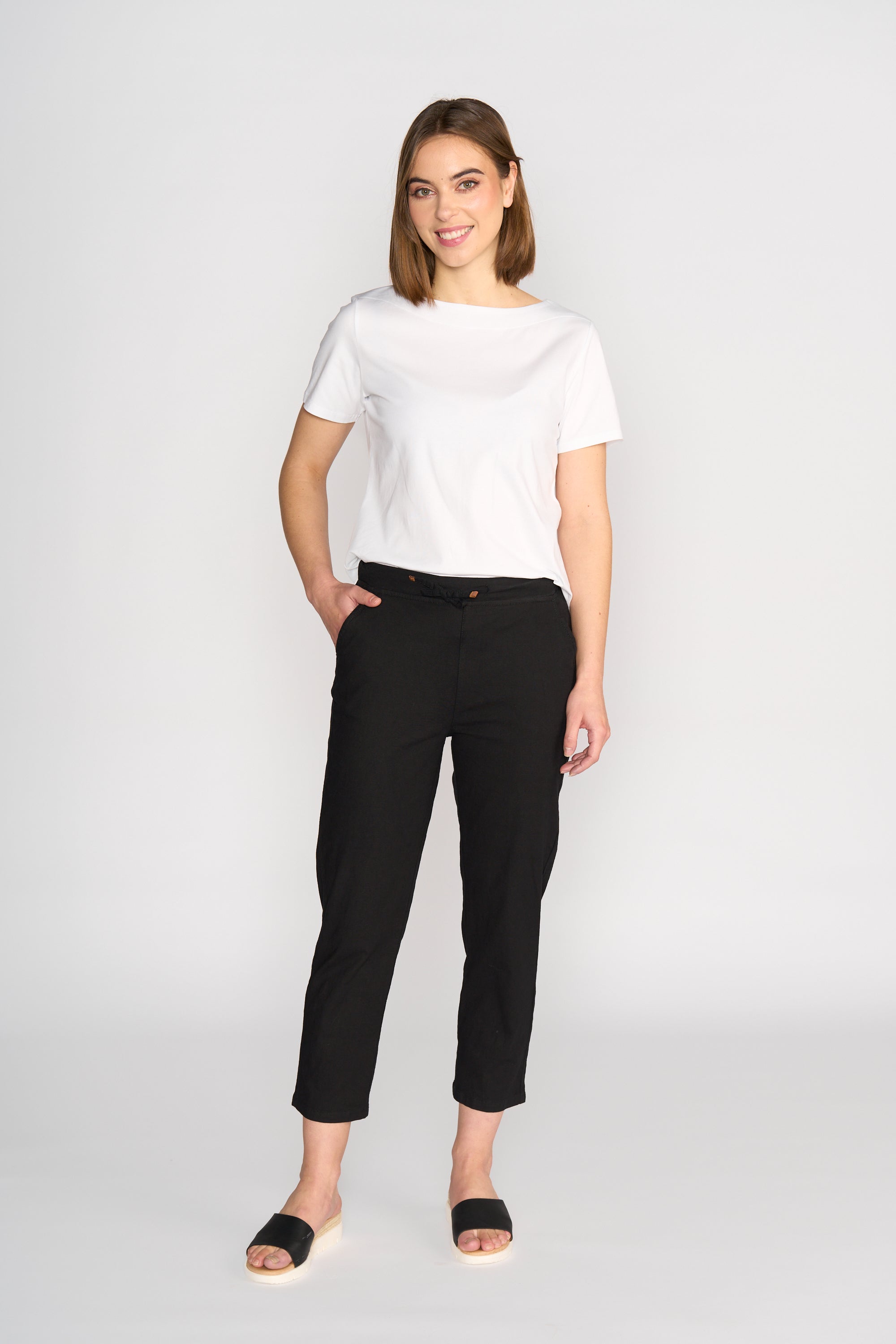 Ankle grazer slim leg pant made from a soft cotton-viscose stretch fabric for the perfect fit. Designed with an elastic waistband, front side angle pockets, and back faux welt pockets for a neat, everyday look.