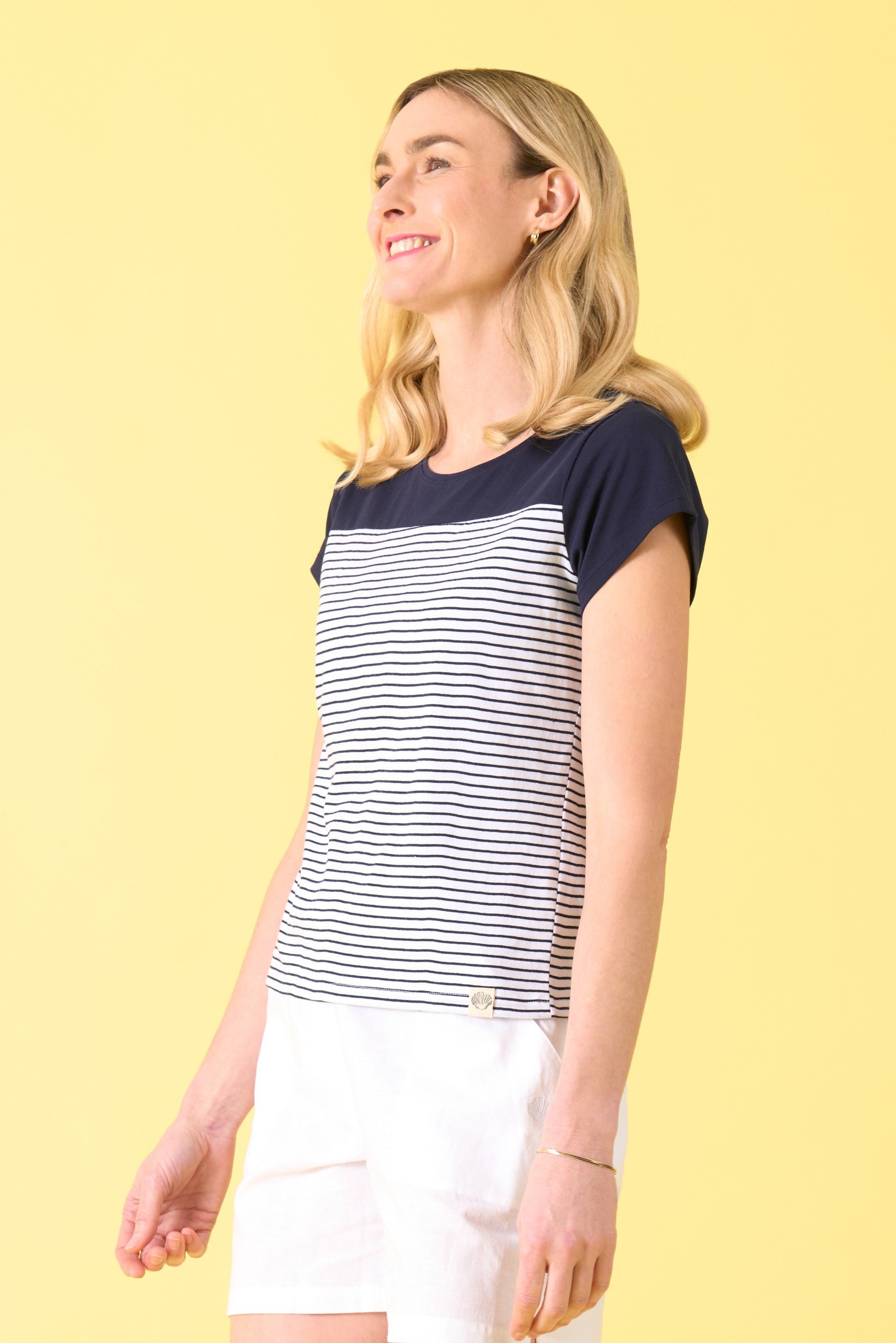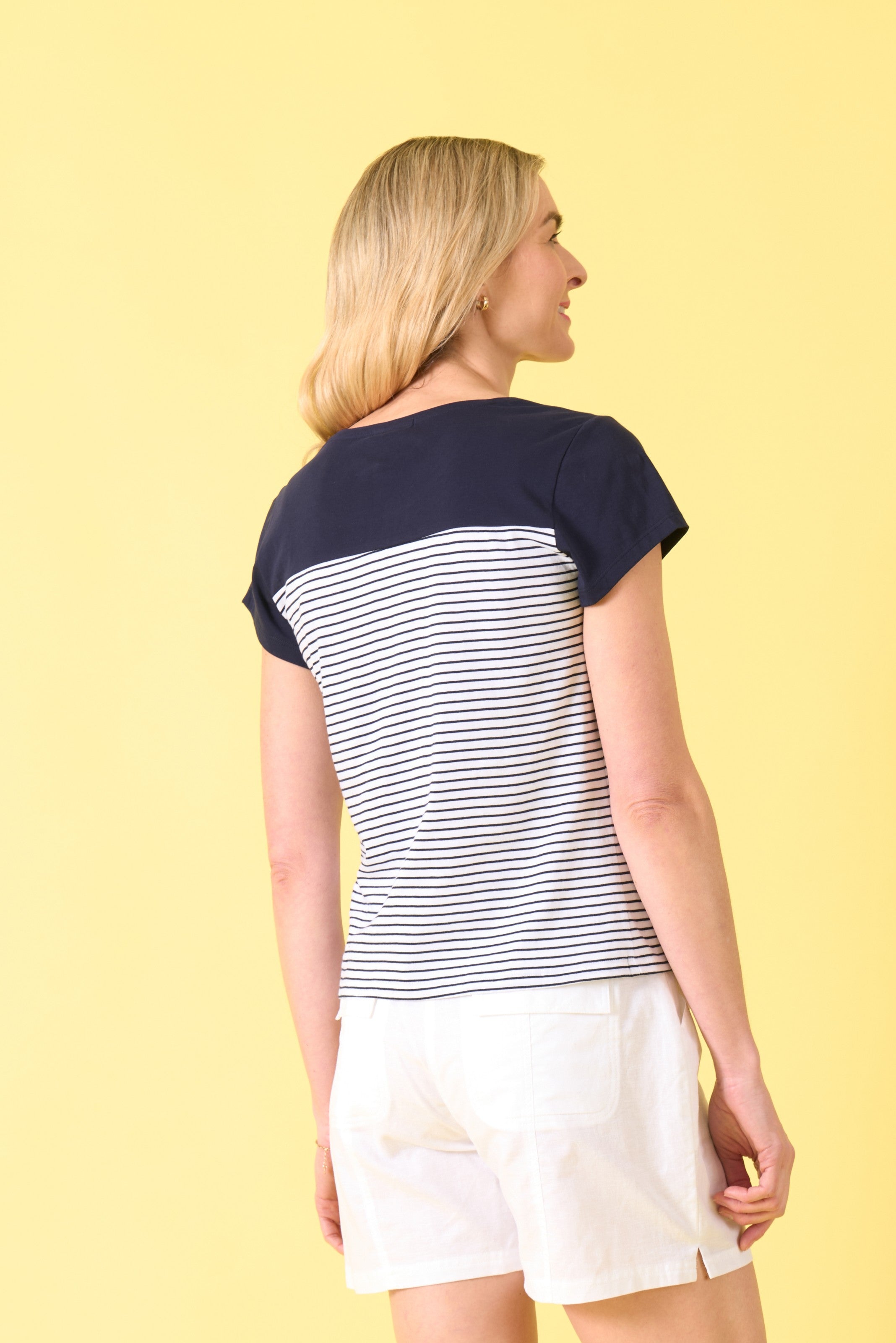 Embrace a timeless nautical vibe with the Charlie Jane Sumner Tee in a classic Navy colourway. This tee is a fresh and stylish take on a wardrobe staple, featuring a chic colour block design that combines a solid navy shade on the top with a crisp white and navy stripe on the body.