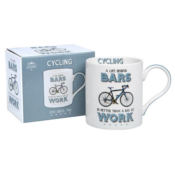 'A Life Behind Bars is better than a day at work' a comical scripted fine china mug with a cycling themed illustration.