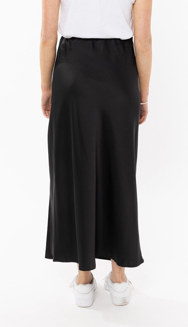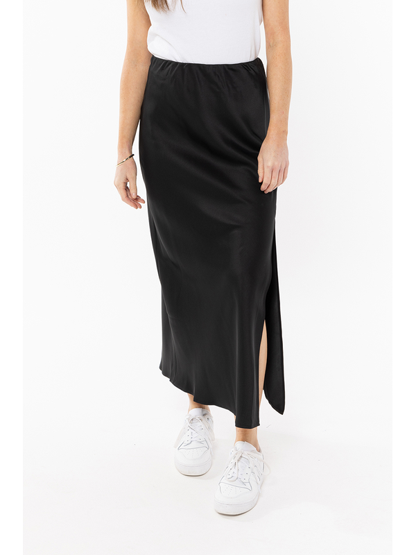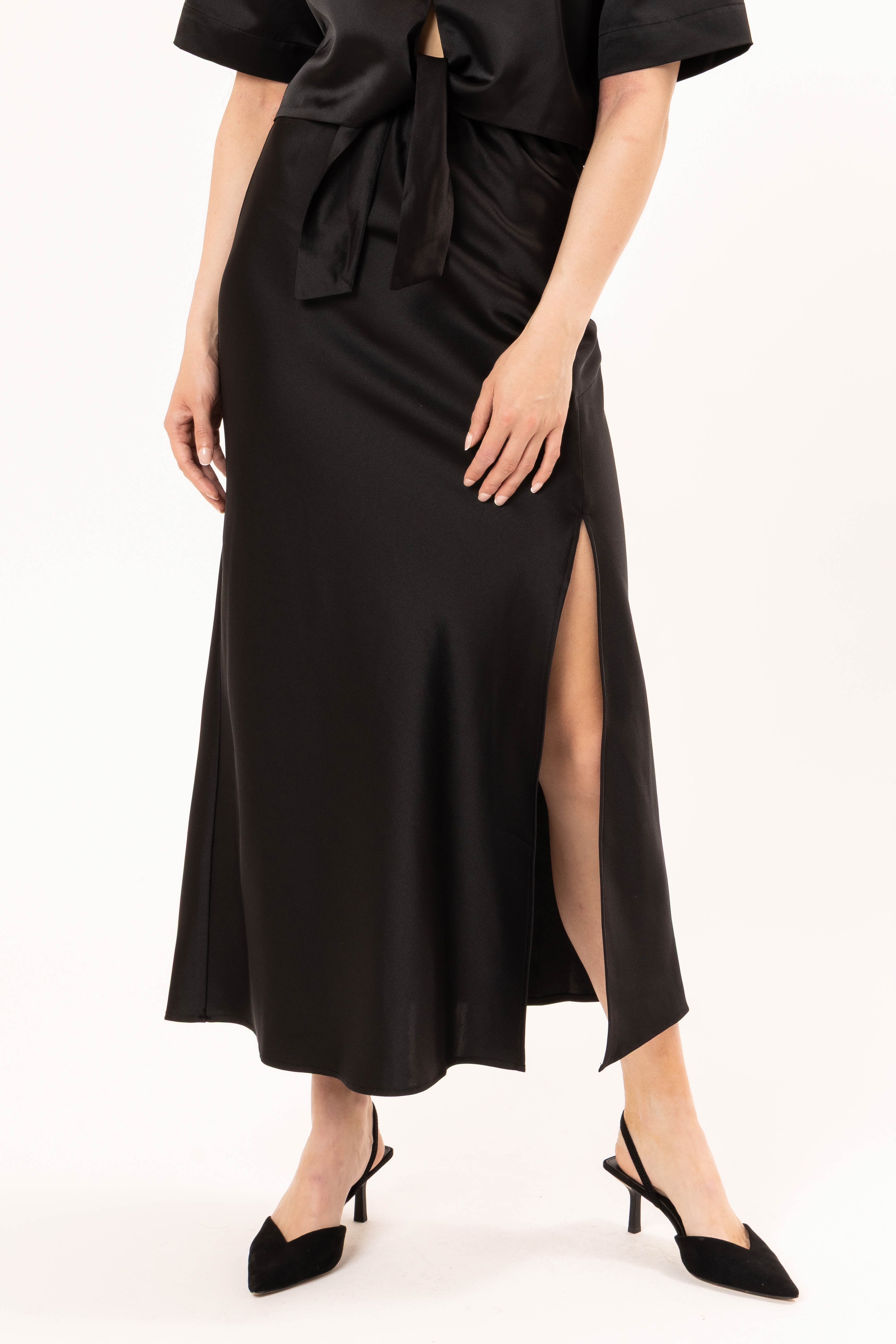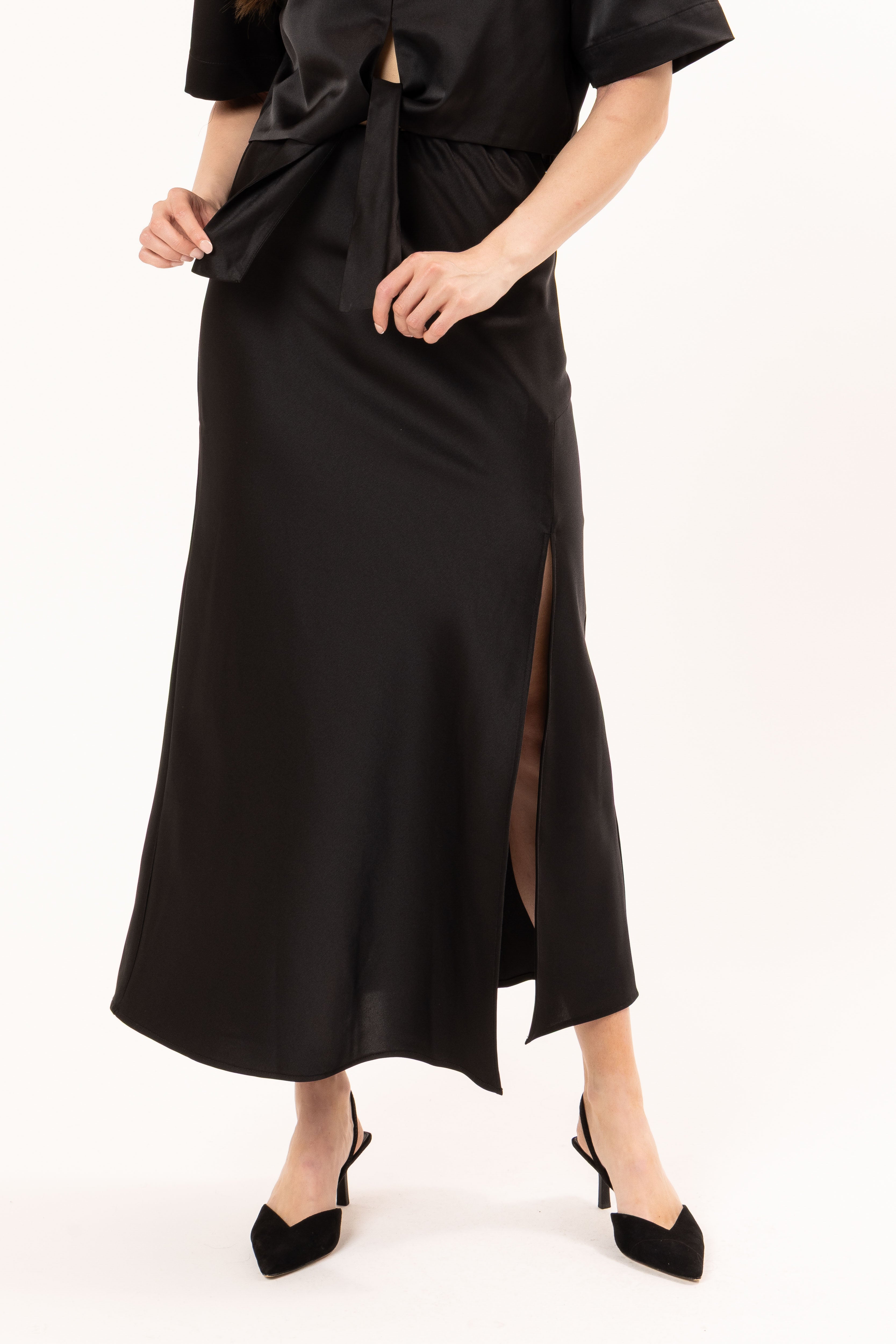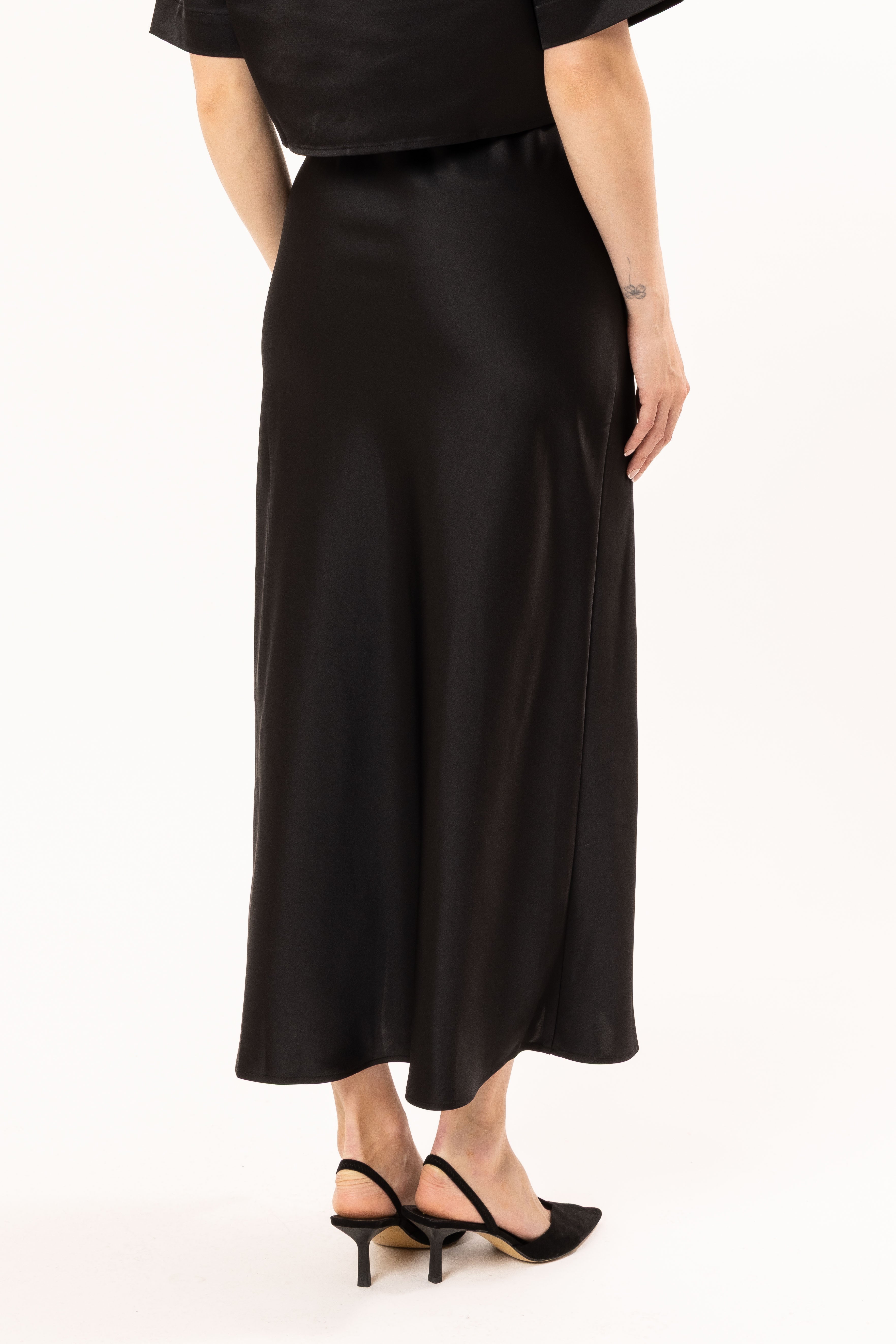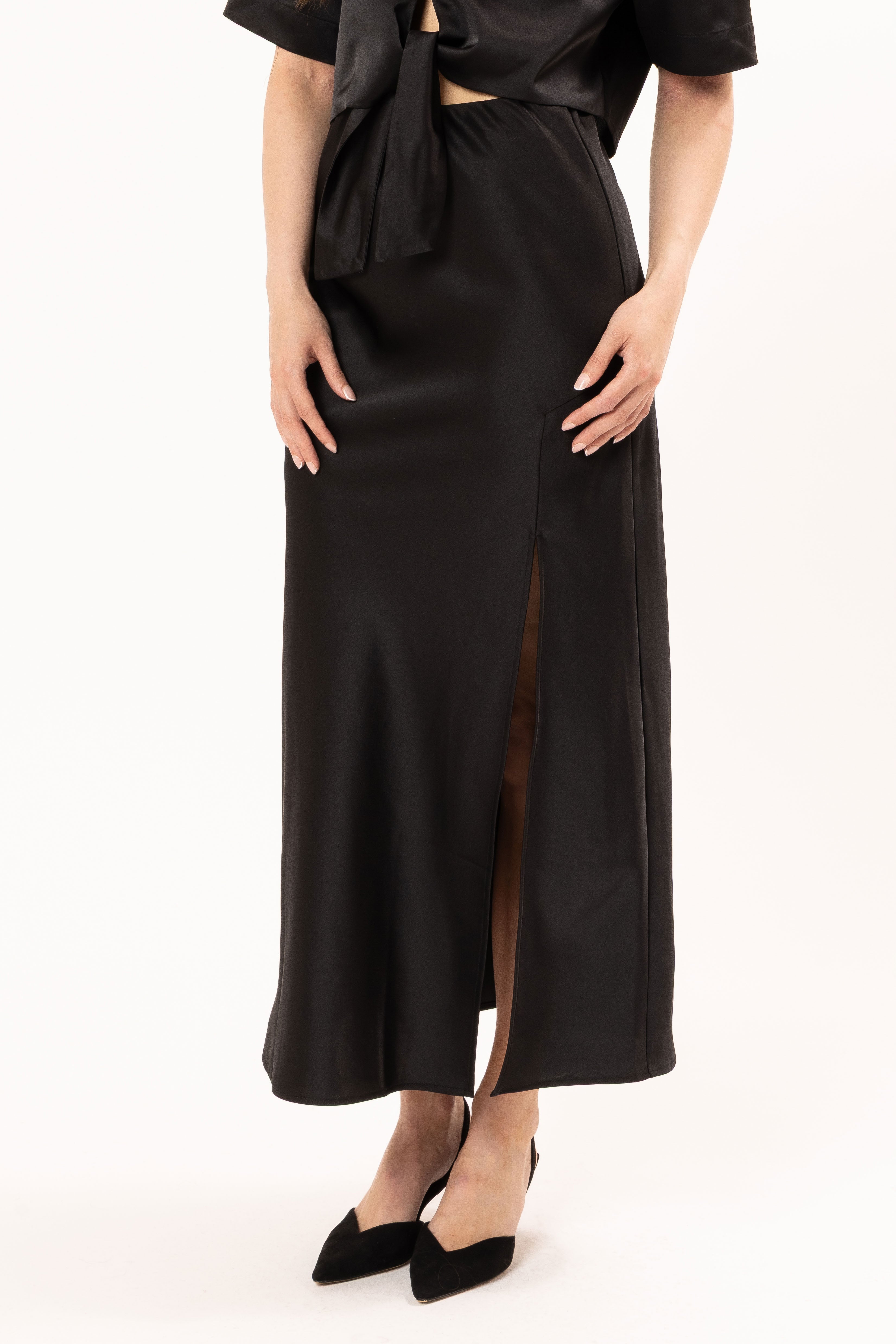 Add a touch of noir glamour to your collection with the Viva Skirt. This floor-length satin skirt combines a minimalist aesthetic with striking details, making it the perfect base for any outfit.
