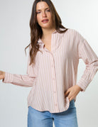 The blouse features a beautiful Lurex striped design, adding a hint of shimmer to the classic vertical stripe pattern. Designed with a relaxed fit and dropped shoulders, it offers a modern, slouchy silhouette that remains polished and professional.