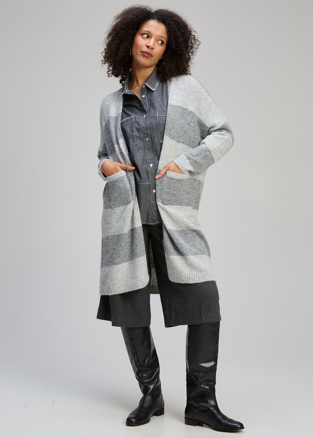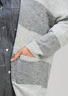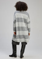 The Zaket & Plover Longline Luxe Cardi is the ultimate layering piece for the cooler months. Designed in a soothing "Dove" colourway, this cardigan features wide, block stripes in tonal shades of grey and silver, creating a look that is both modern and timeless.